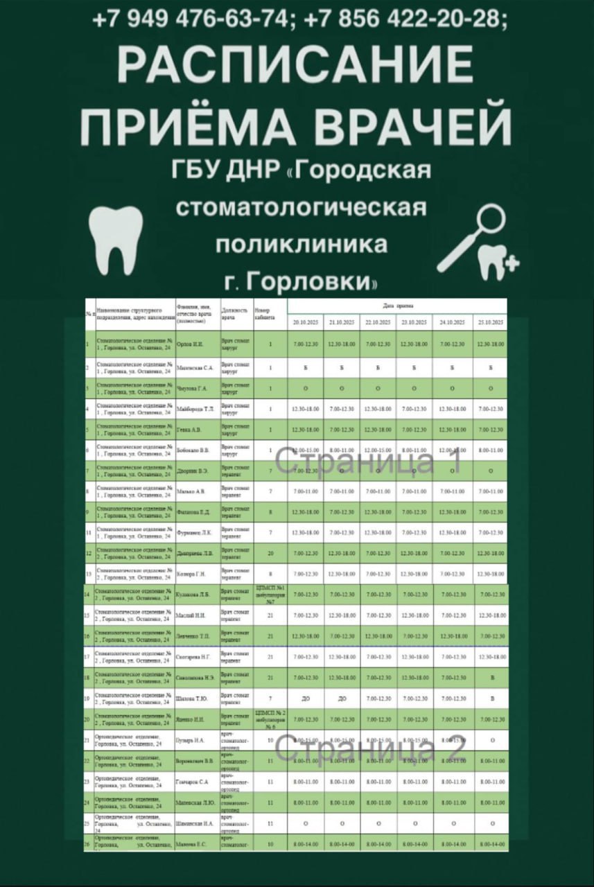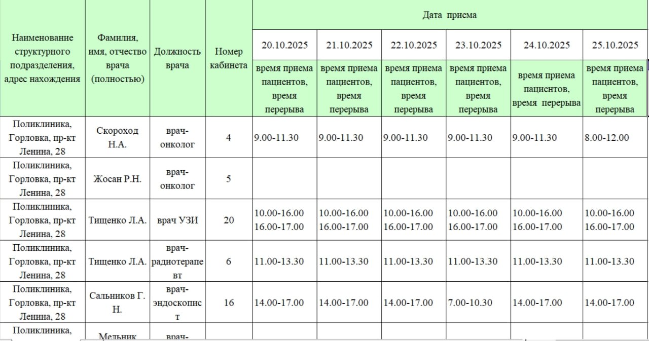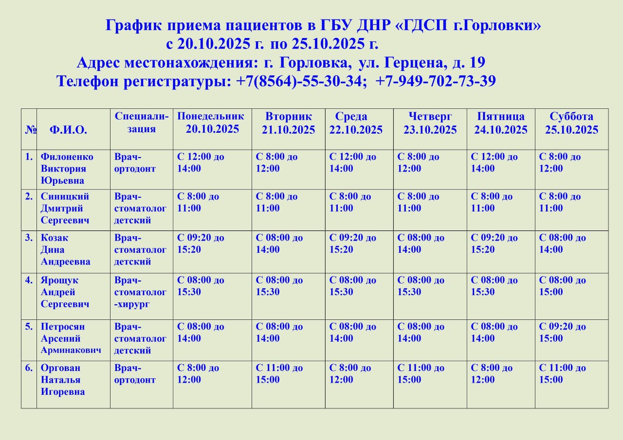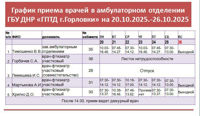 Иван Приходько: График работы специалистов ГБУ ДНР «ГДСП г.Горловки», ГБУ ДНР «Городской наркологический диспансер г. Горловки», ГБУ ДНР «ГПБ г. Горловки», ГБУ ДНР «ГПТД г.Горловки», ГБУ ДНР «ГДВД г.Горловки», ГБУ ДНР «ГСП...