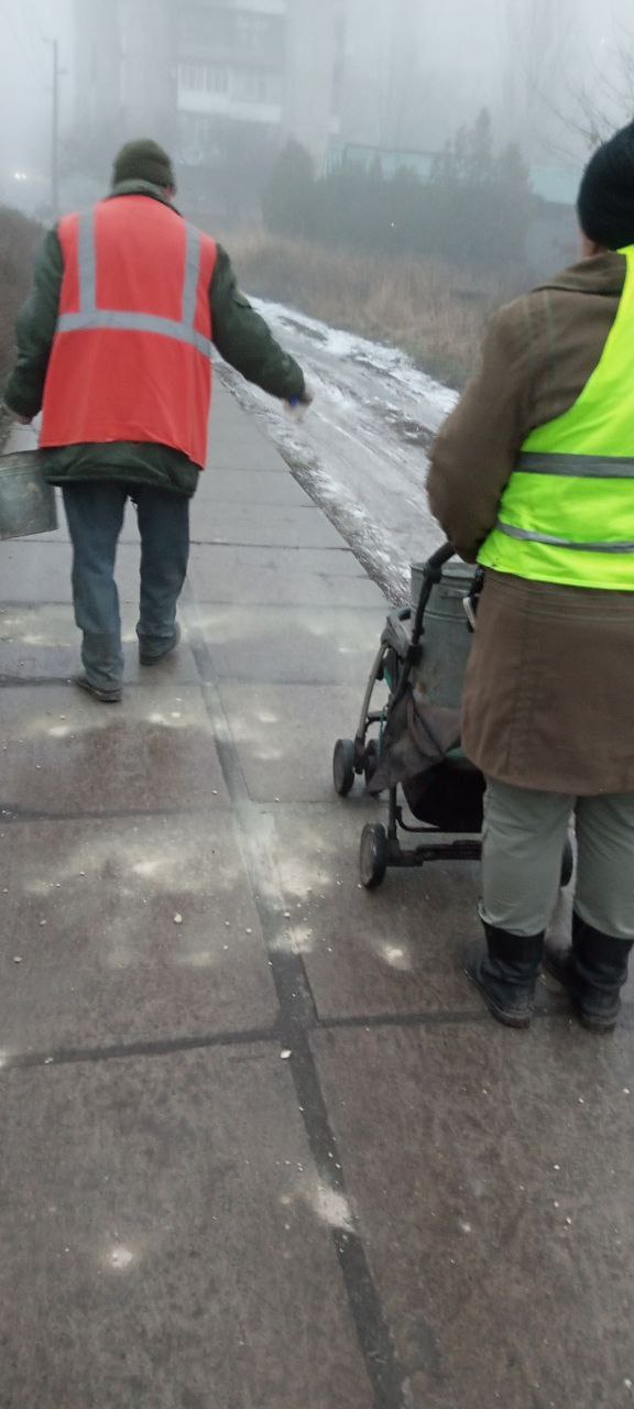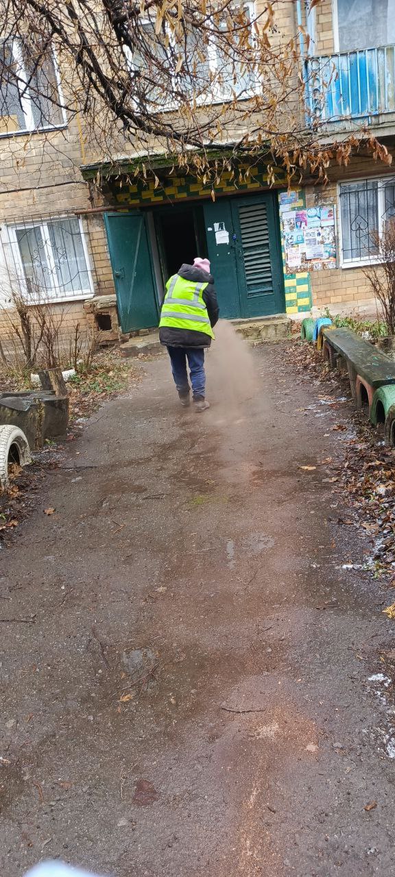 - посыпка противоголёдными смесями тротуаров, внутриквартальных проездов, подходов к жилым домам и ступеней.