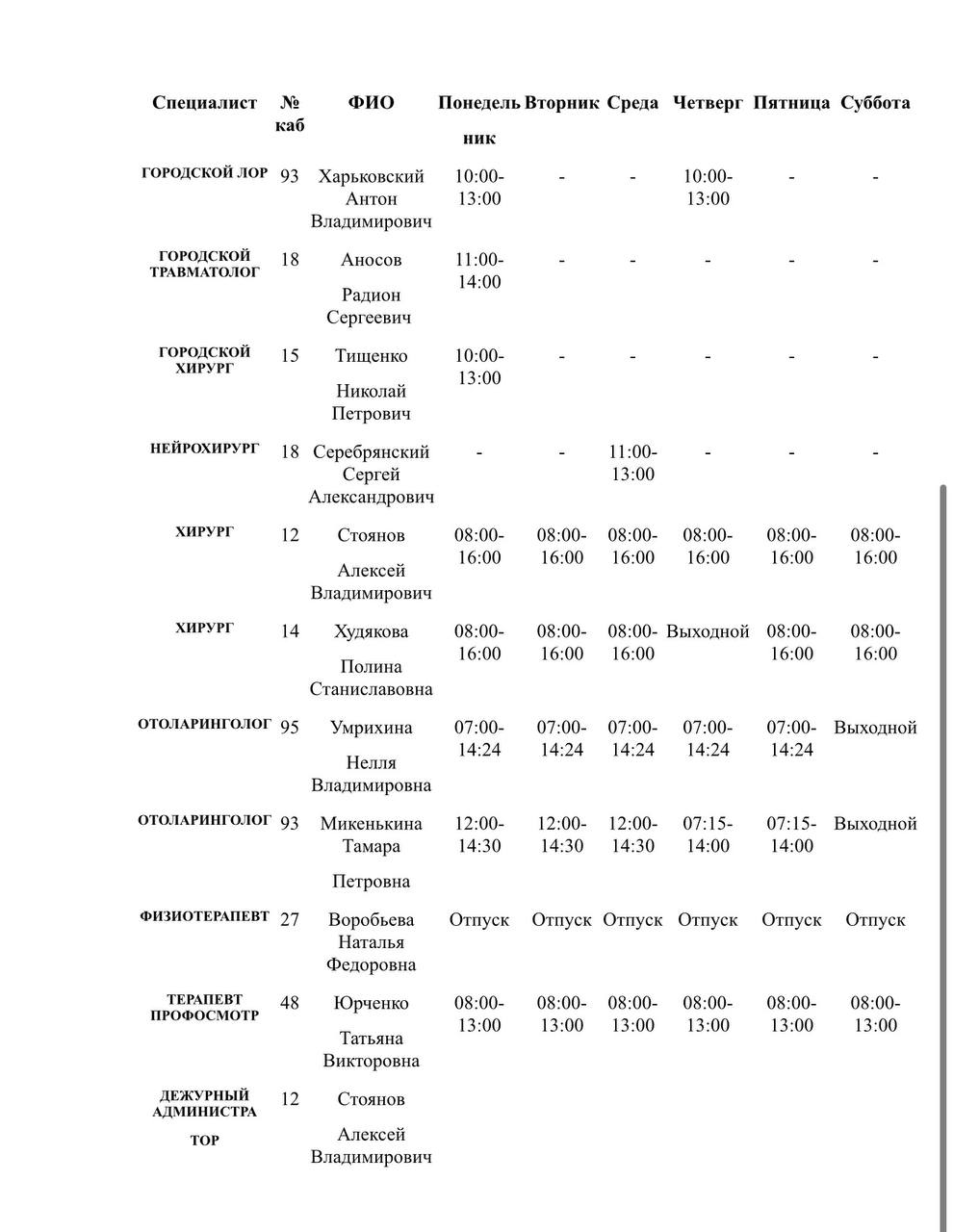 График работы специалистов ГБУ ДНР «Городская больница № 3 г. Горловки»