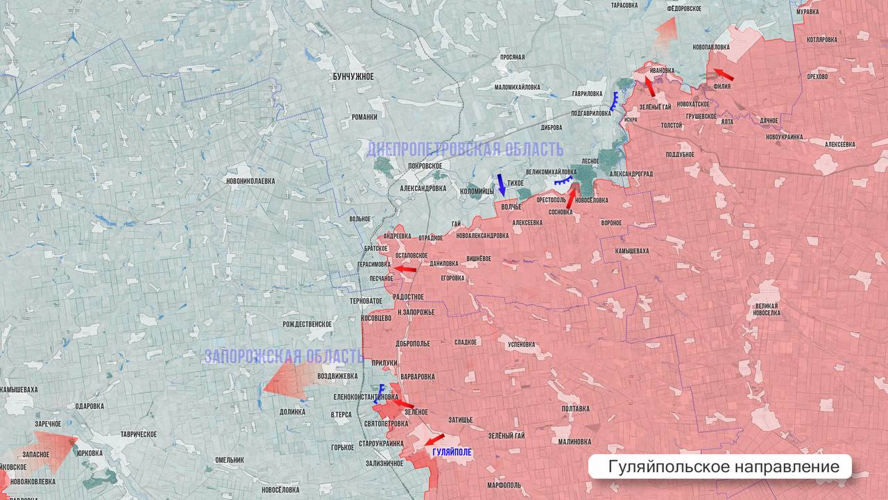 На Гуляйпольском участке Минобороны РФ сообщило об освобождении села Прилуки, что на правом берегу р Гайчур в 1,5 км к северу от накануне освобождённого Жовтневого (Еленоконстантиновки). Под контроль армии России перешёл узел обороны ВСУ площадью до 15 км. Освобождение села позволяет расширить плацдарм на западном берегу реки Гайчур, занять ближайшие высоты и продолжить наступление вглубь Запорожской обл.