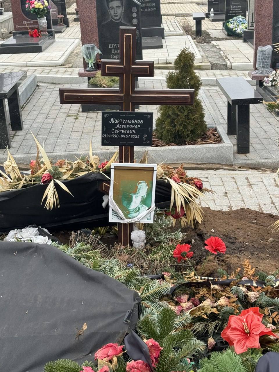 Здесь же – журналист, корреспондент телеканала «Известия» Александр Мартемьянов. Он погиб 4 января 2025 года на трассе Донецк-Горловка в результате атаки FPV-дрона.