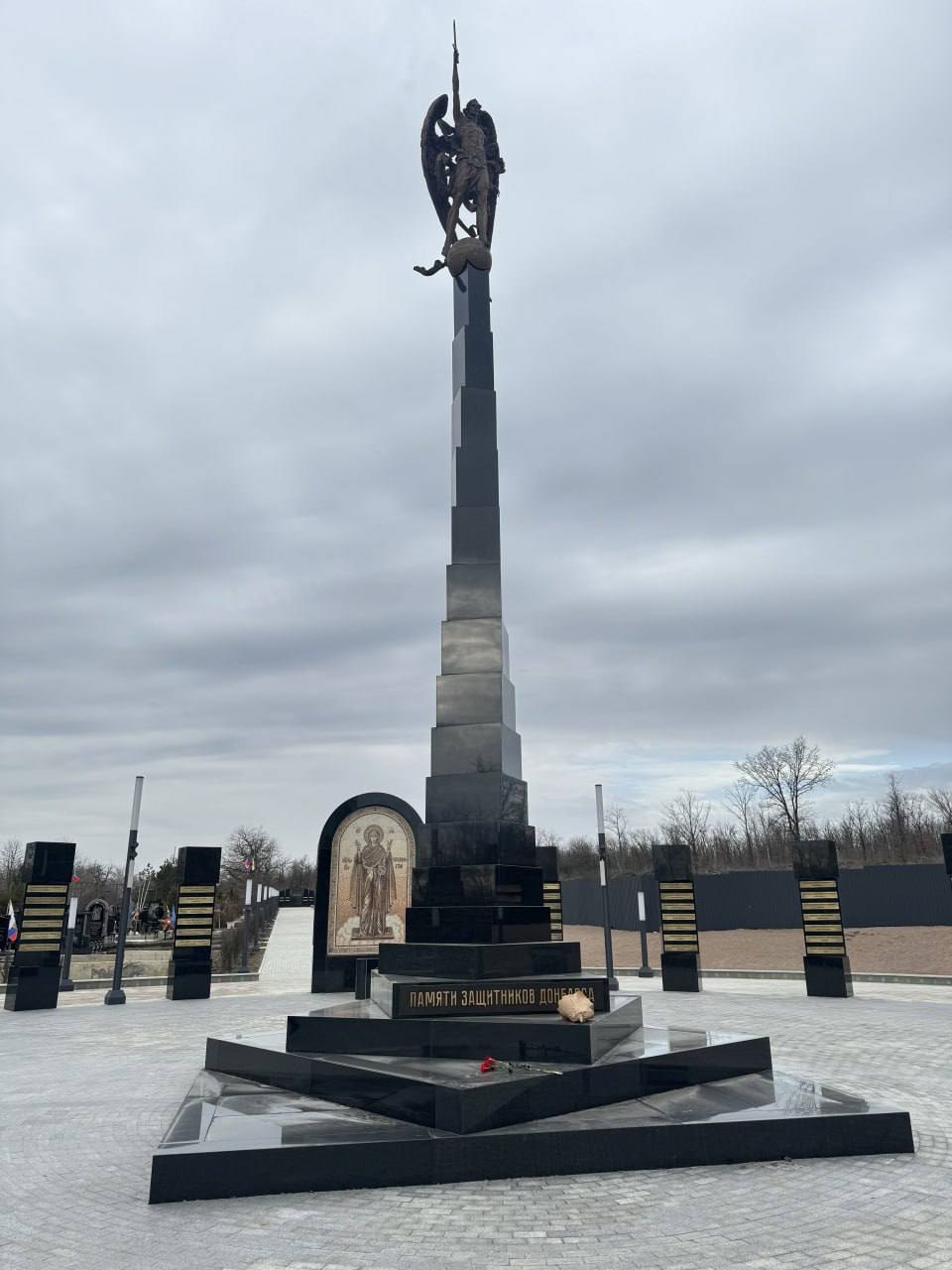 Его центральной частью стала высокая стела, облицованная чёрным гранитом и увенчанная фигурой Архангела Михаила – небесного защитника воинства. У её основания высечены слова: «Памяти защитников Донбасса».