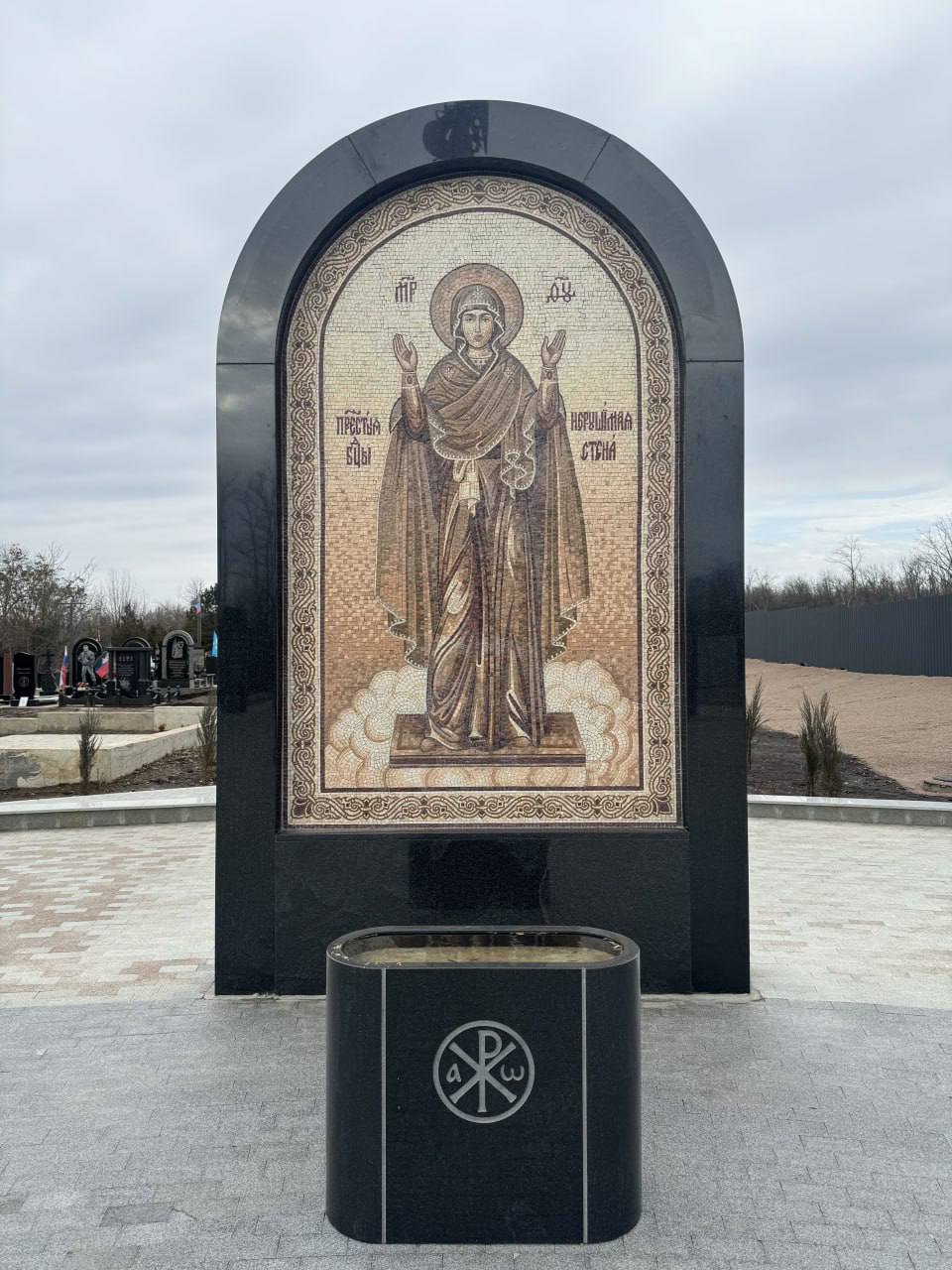 Рядом установлены гранитные плиты с именами героев, а также большая мозаичная икона Божией Матери «Нерушимая стена». Вокруг стелы – чёрные гранитные тумбы. От центральной части мемориала тянется аллея, которая ведёт к существующим захоронениям на Аллее Героев.