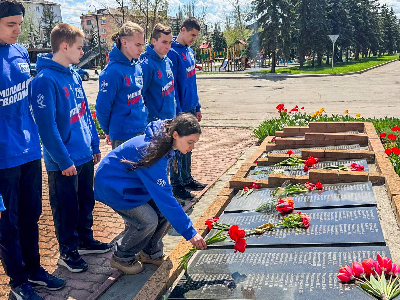 В память о погибших активисты Молодёжки Горловки возложили цветы к памятнику.