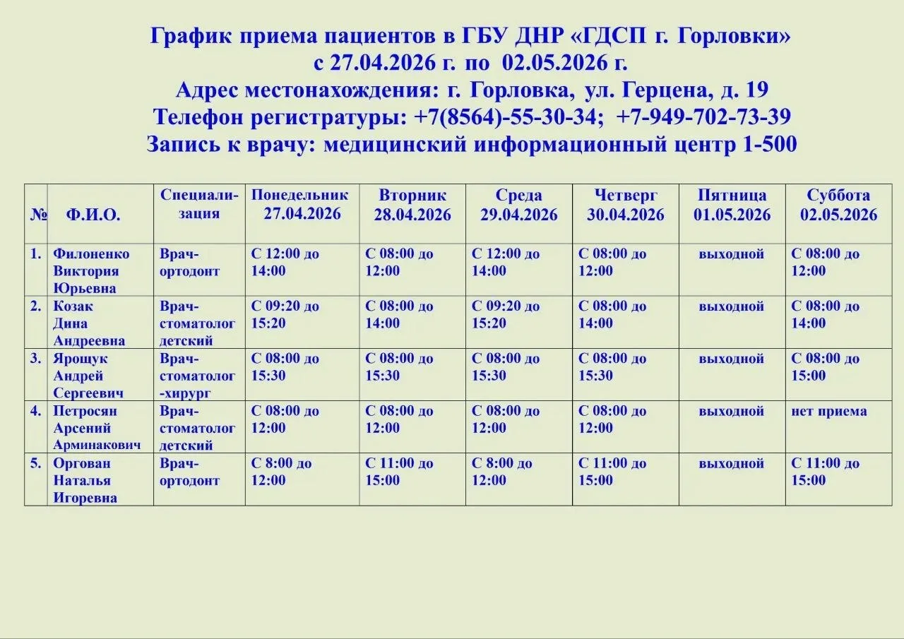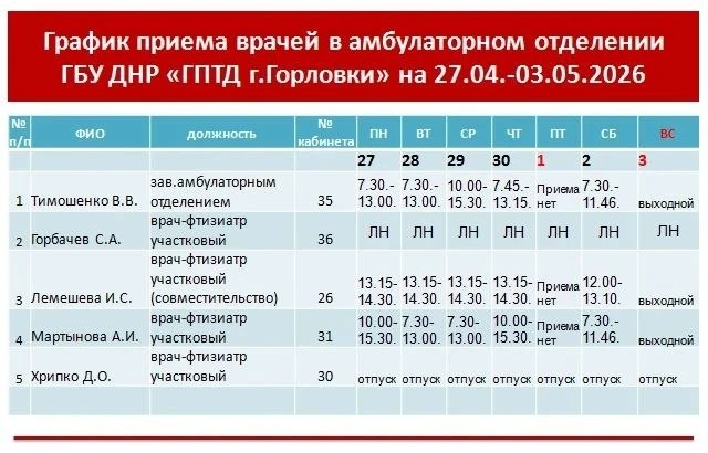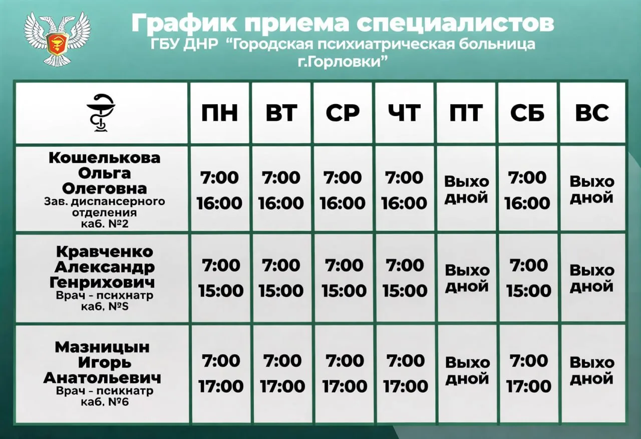 Иван Приходько: График работы специалистов ГБУ ДНР «ГДСП г.Горловки», ГБУ ДНР «Городской наркологический диспансер г. Горловки», ГБУ ДНР «ГПБ г. Горловки», ГБУ ДНР «ГПТД г.Горловки», ГБУ ДНР «ГДВД г.Горловки», ГБУ ДНР «ГСП...