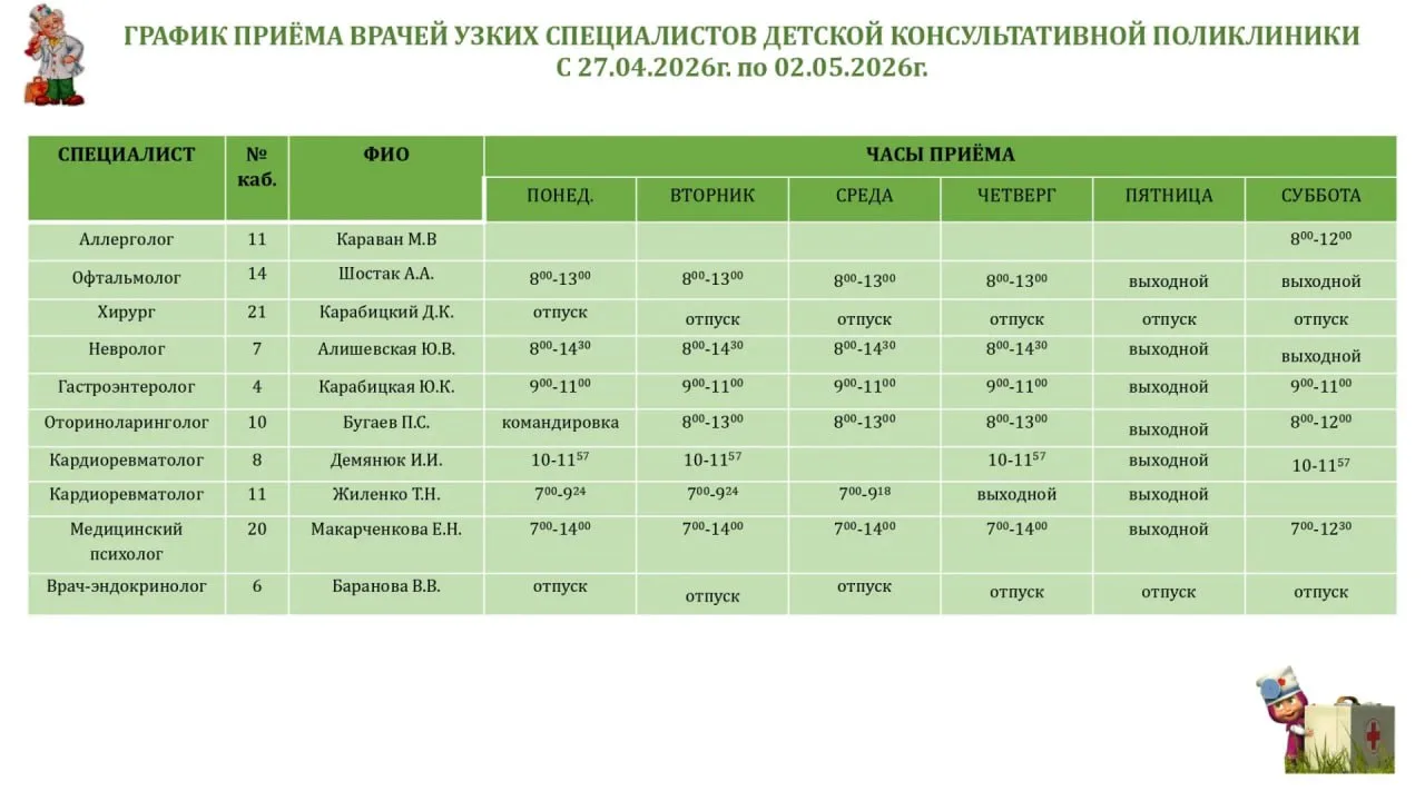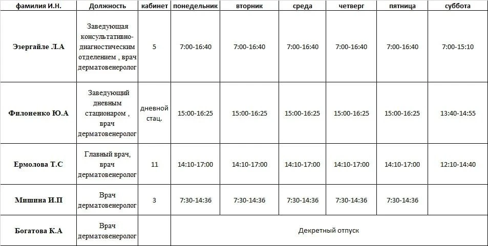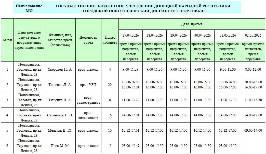 График работы специалистов ГБУ ДНР «Городская больница № 1 г. Горловки»
