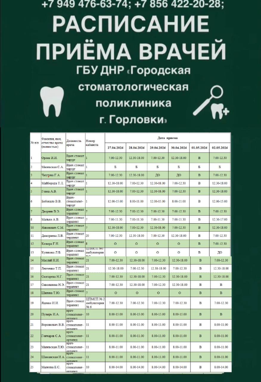 График работы специалистов ГБУ ДНР «ГДСП г.Горловки», ГБУ ДНР «Городской наркологический диспансер г. Горловки», ГБУ ДНР «ГПБ г. Горловки», ГБУ ДНР «ГПТД г.Горловки», ГБУ ДНР «ГДВД г.Горловки», ГБУ ДНР «ГСП г.Горловки», ГБУ ДНР «ГОД г. Горловки», ГБУ ДНР «ГСП № 4 г.Горловки», ГБУ ДНР «ЦОМД г. Горловки»