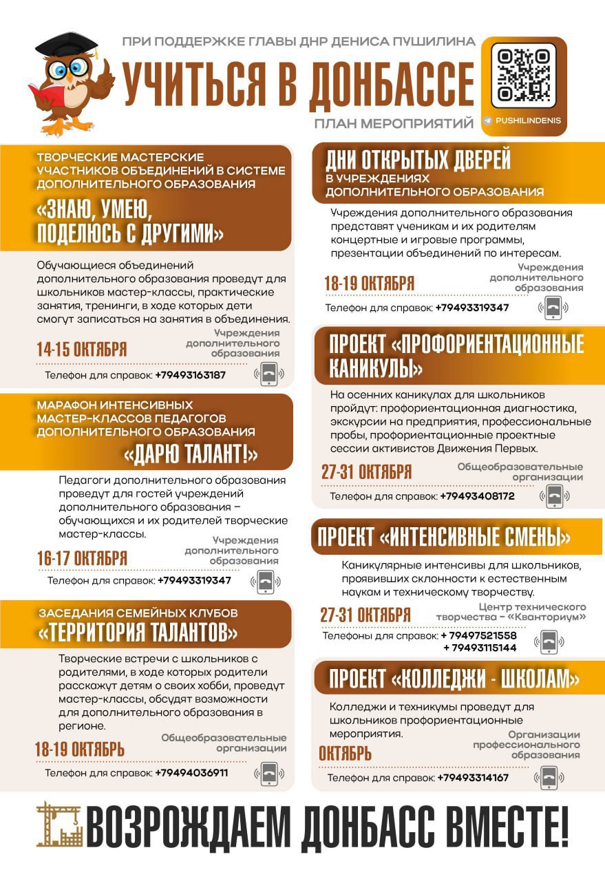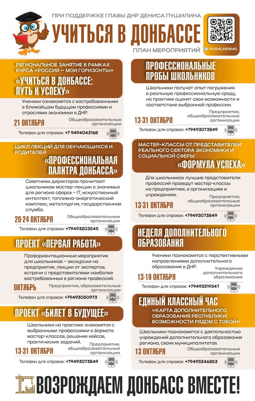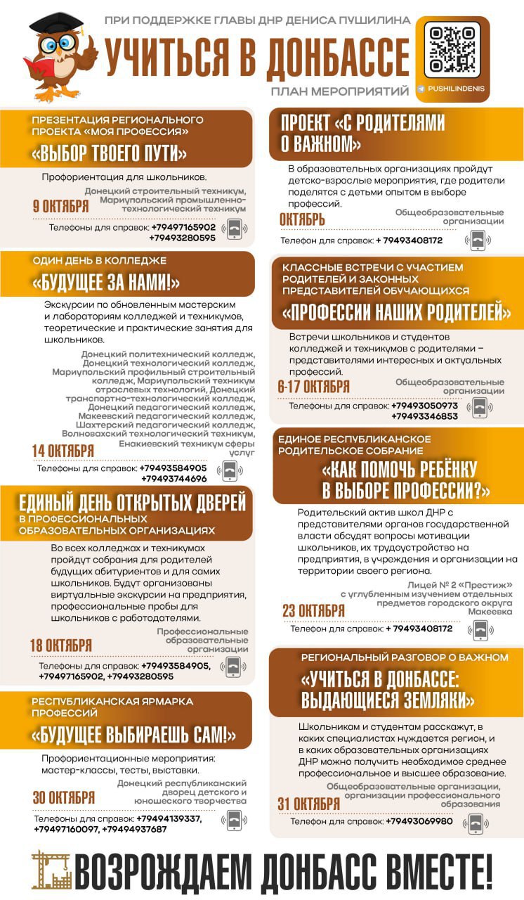 Сегодня запускаем акцию «Учиться в Донбассе». В течение октября проведем порядка десяти тысяч мероприятий по профориентации и расскажем о дополнительном образовании в ДНР.