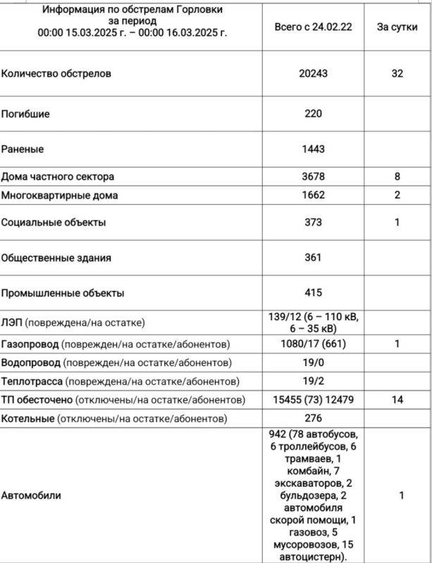 Информация по обстрелам Горловки с 00:00 15.03.2025 г. по 00:00 16.03.2025 г.