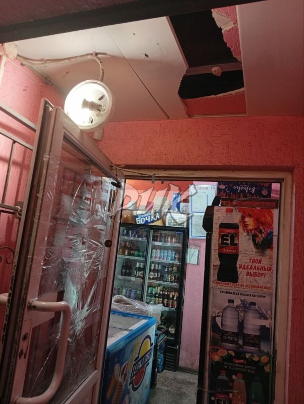 Последствия удара БПЛА ВФУ вчера около 22:00. Поврежден магазин в микрорайоне «Квартал 245» (Центрально-Городской район Горловки).