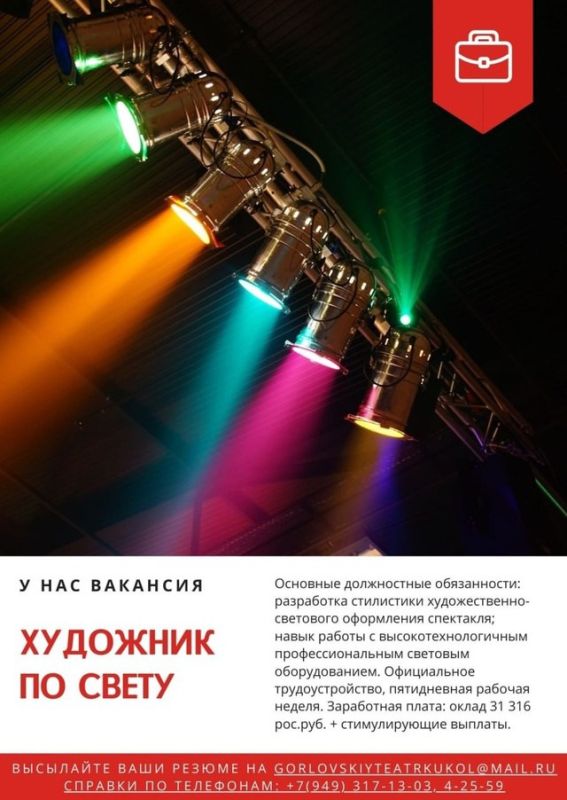 Заинтересован? Присылай свое резюме на: gorlovskiyteatrkukol@mail.ru
