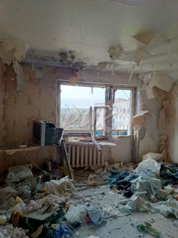 Последствия атаки дрона ВФУ по квартирам одного из домов в жилом массиве «Комсомолец» сегодня ночью.