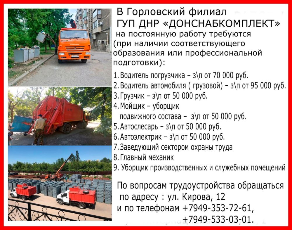 Вакансии ГОРЛОВСКОГО ФИЛИАЛА ГОСУДАРСТВЕННОГО УНИТАРНОГО ПРЕДПРИЯТИЯ ДОНЕЦКОЙ НАРОДНОЙ РЕСПУБЛИКИ «ДОНСНАБКОМПЛЕКТ»