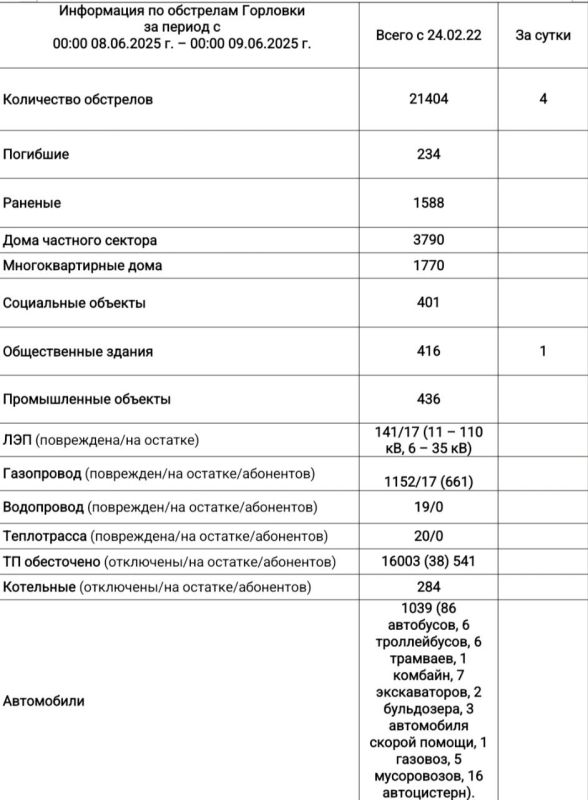 Информация по обстрелам Горловки с 00:00 08.06.2025 г. по 00:00 09.06.2025 г.