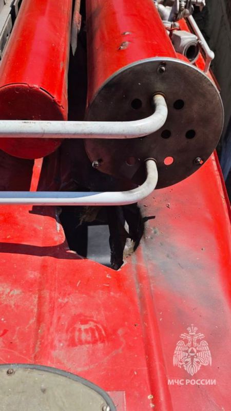 Заметив приближающийся дрон, спасатели успели покинуть машину. Однако беспилотник совершил прицельный сброс взрывного устройства на пожарную автоцистерну. В результате атаки автомобиль получил серьезные повреждения, в том числе пробитую крышу над водительским местом.