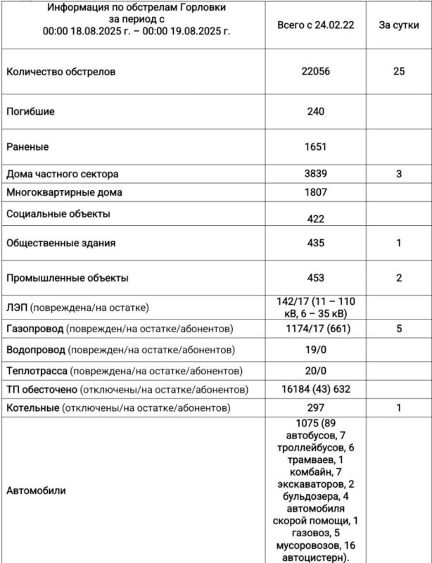 Информация по обстрелам Горловки с 00:00 18.08.2025 г. по 00:00 19.08.2025 г.