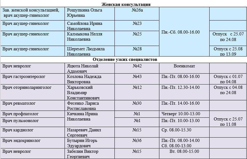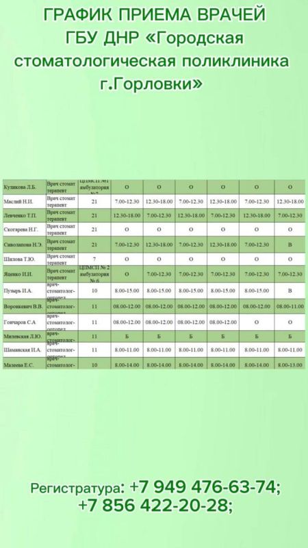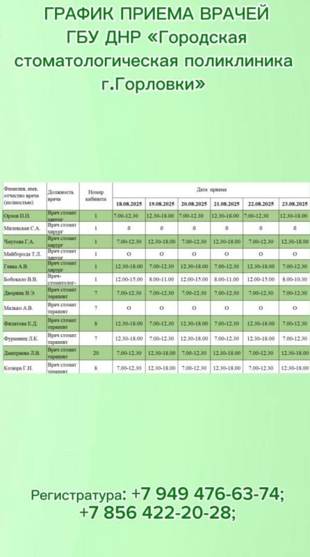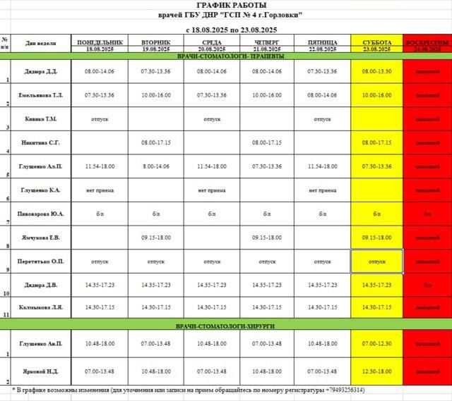 График работы специалистов ГБУ ДНР «ГБ № 1 г.Горловки», ГБУ ДНР «ГСП № 4 г.Горловки», ГБУ ДНР «ГДВД г.Горловки», ГБУ ДНР «ГДСП г.Горловки», Городской наркологический диспансер г.Горловки, ГБУ ДНР «Городская стоматологическая поликлиника г.Горловки»