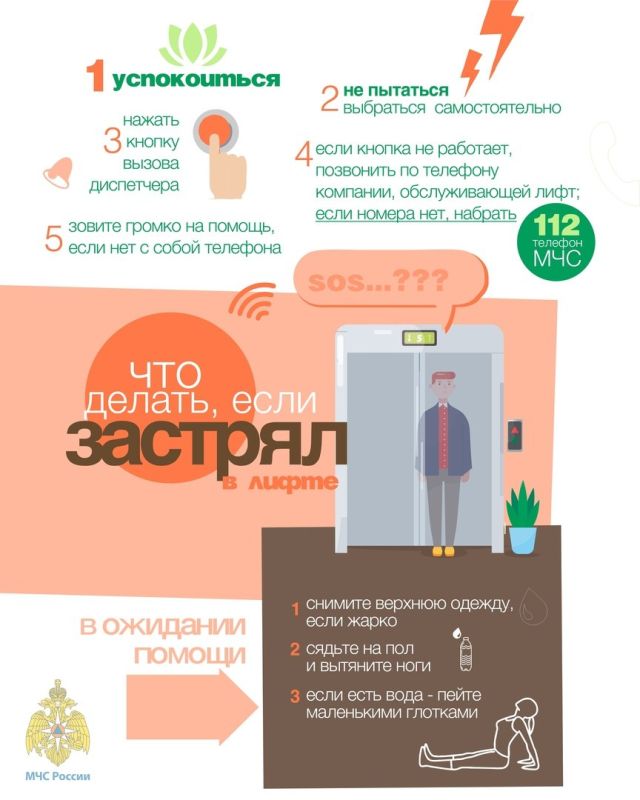 • не пытаться выбраться самостоятельно; исключение — задымление или запах гари, а также ухудшение состояния и угроза здоровью;