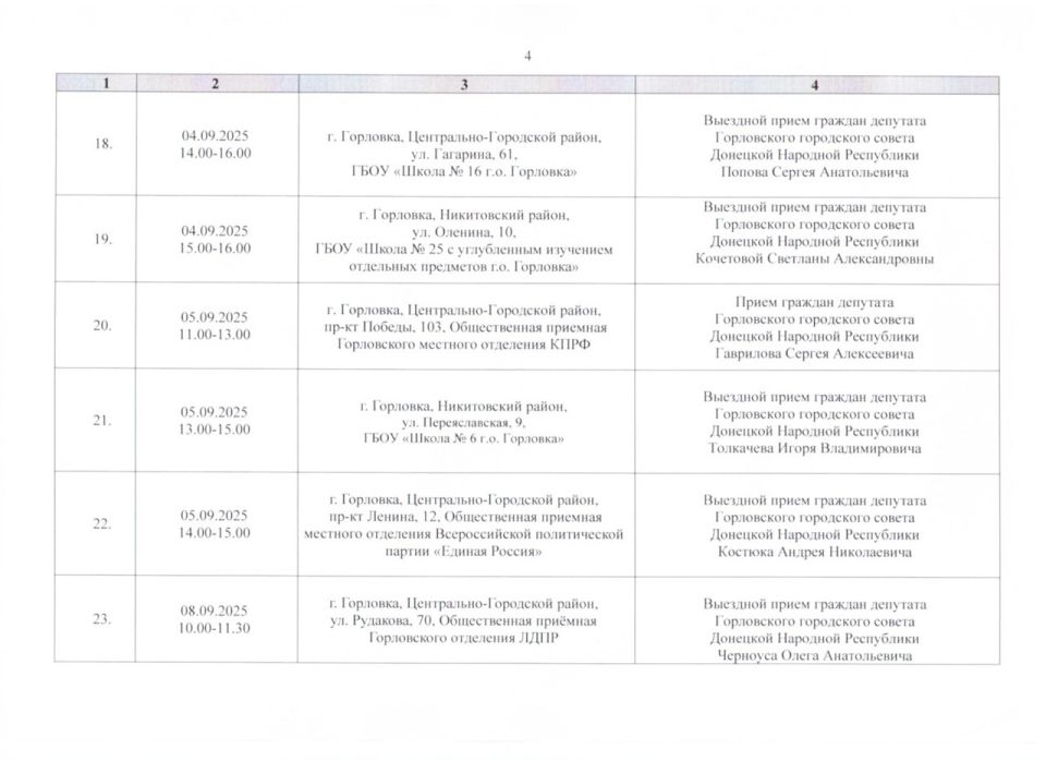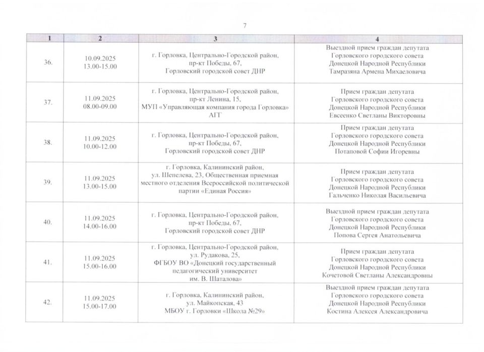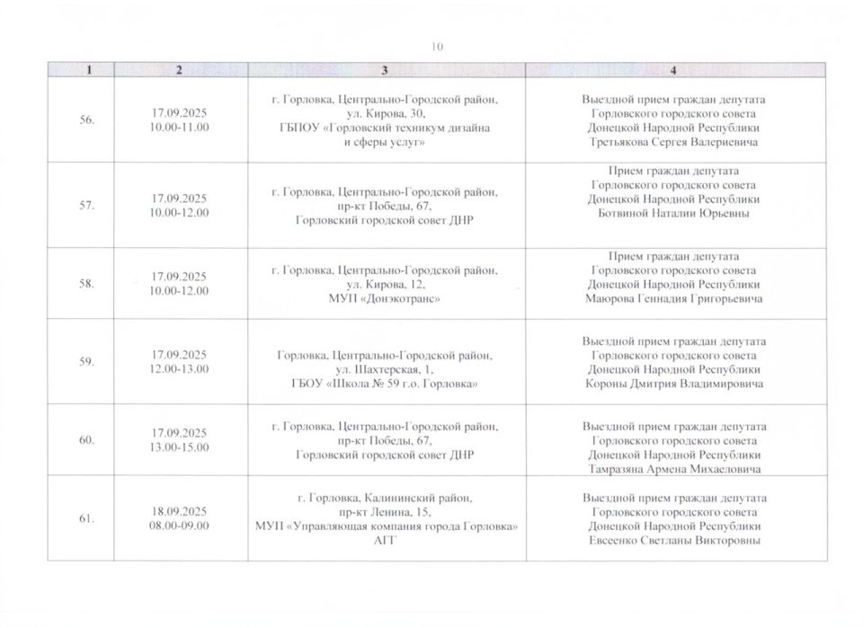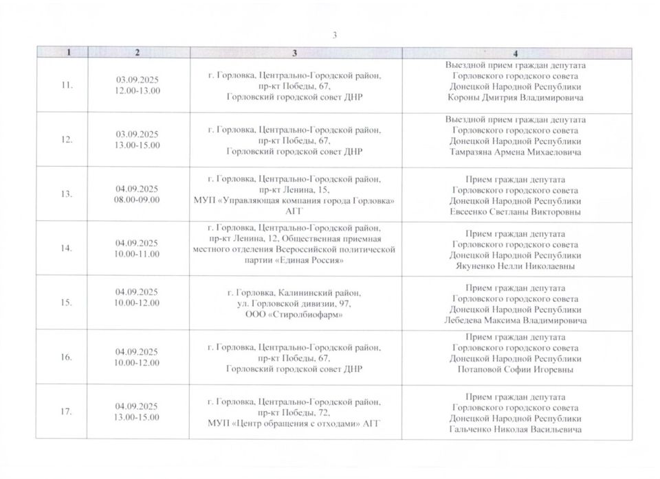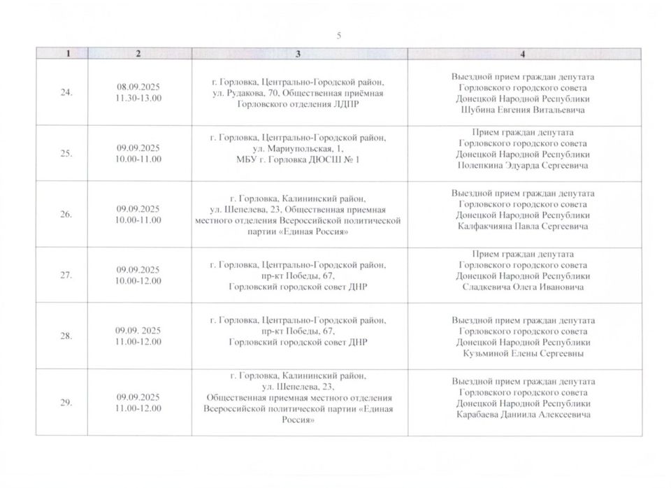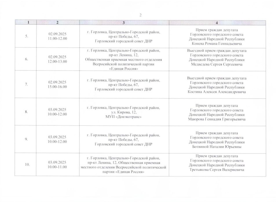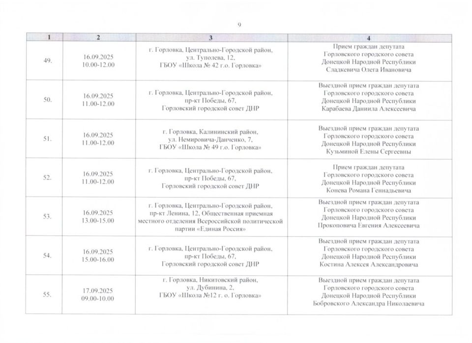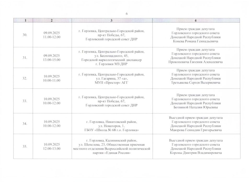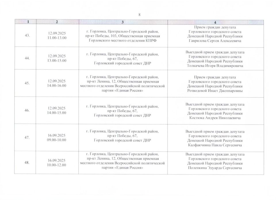 График проведения приёмов депутатами Горловского городского совета Донецкой Народной Республики первого созыва на период с 01.09.2025 г. по 30.09.2025 г. (часть 1)