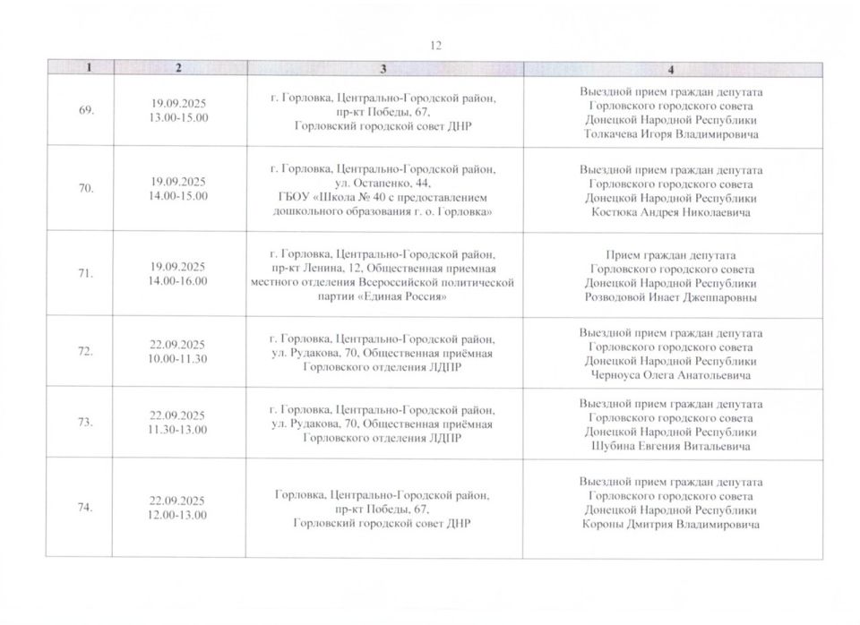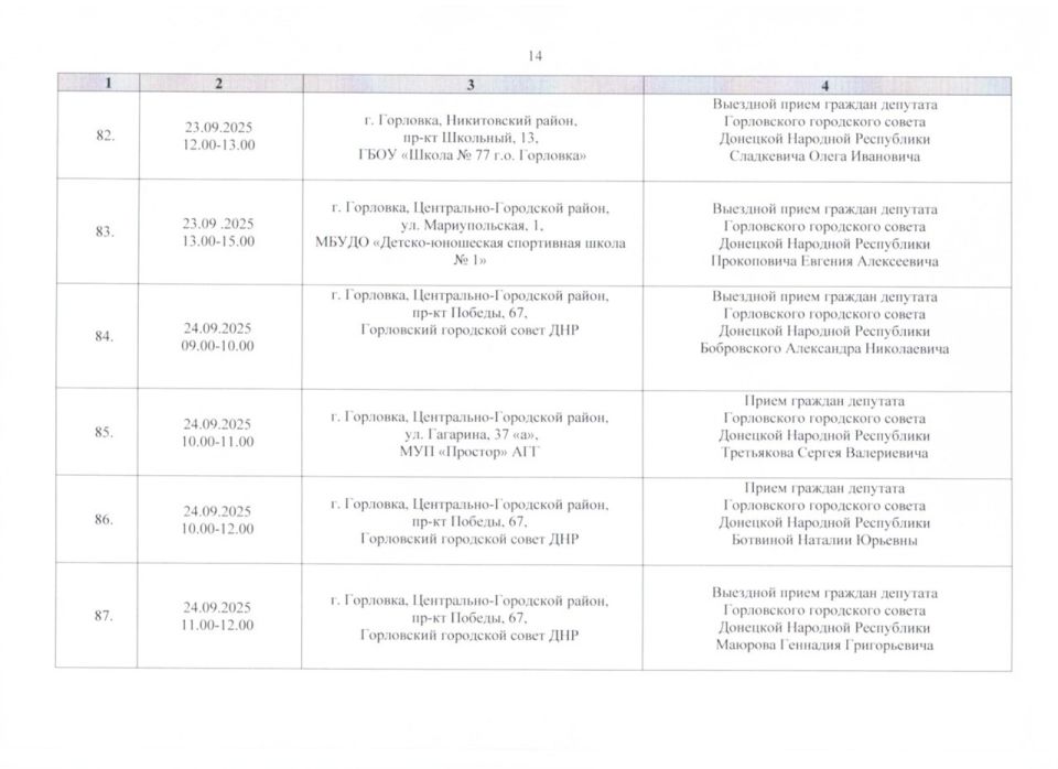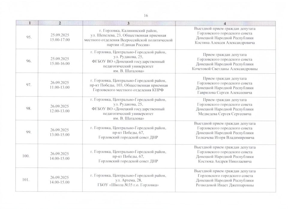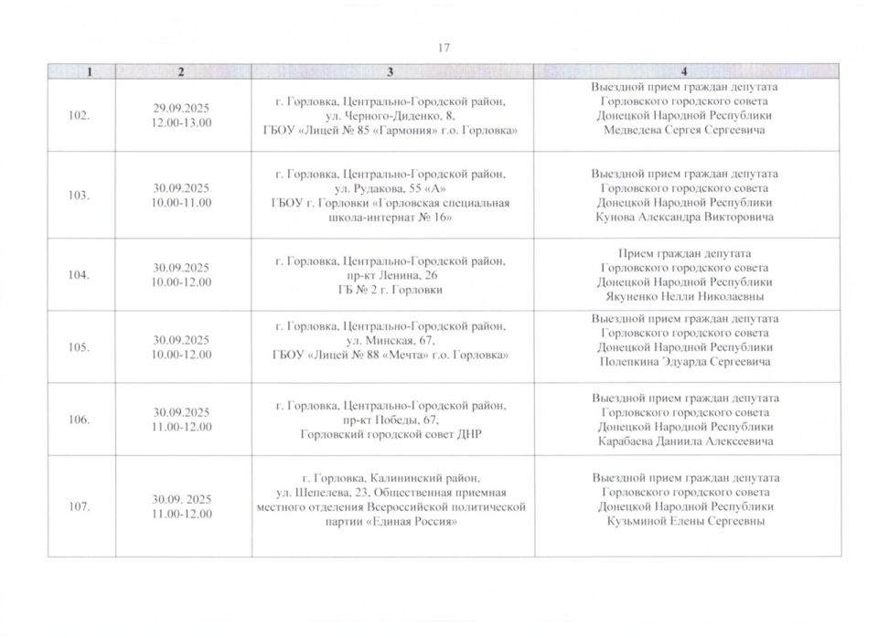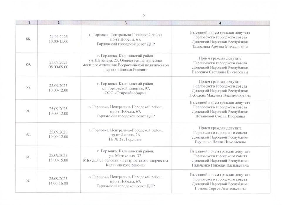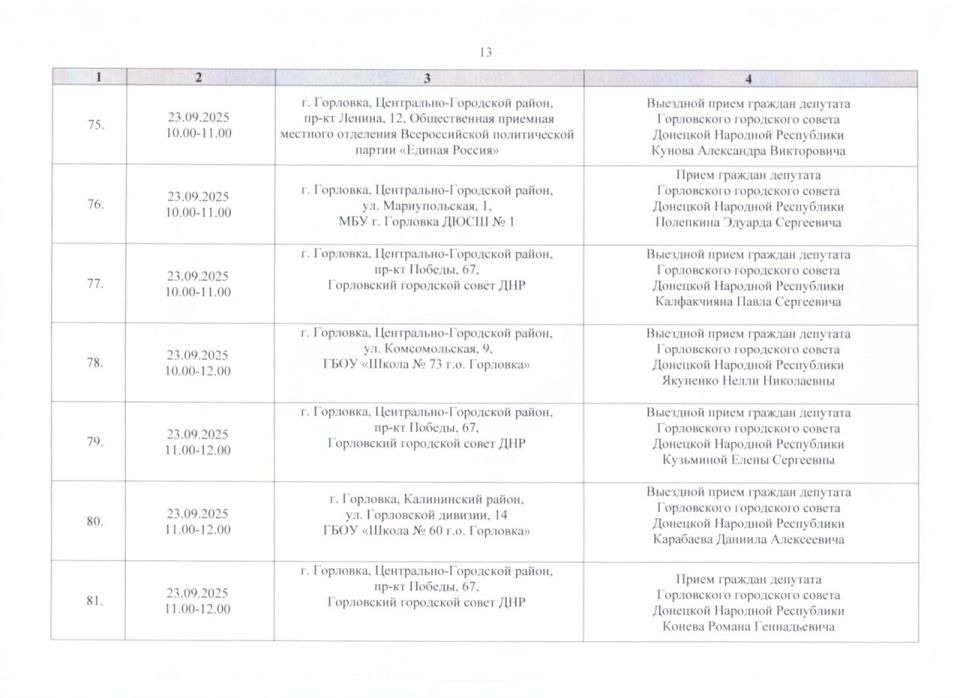 График проведения приёмов депутатами Горловского городского совета Донецкой Народной Республики первого созыва на период с 01.09.2025 г. по 30.09.2025 г. (часть 2)