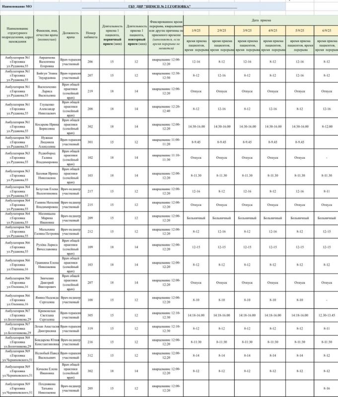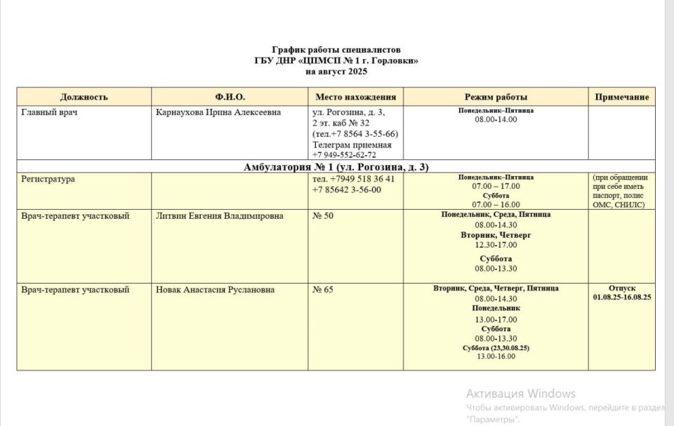Иван Приходько: График работы специалистов ГБУ ДНР «ЦОМД г. Горловки», ГБУ ДНР «ГОД г. Горловки», ГБУ ДНР «ЦПМСП №1 г.Горловки». ГБУ ДНР «ЦПМСП № 2 Горловка»