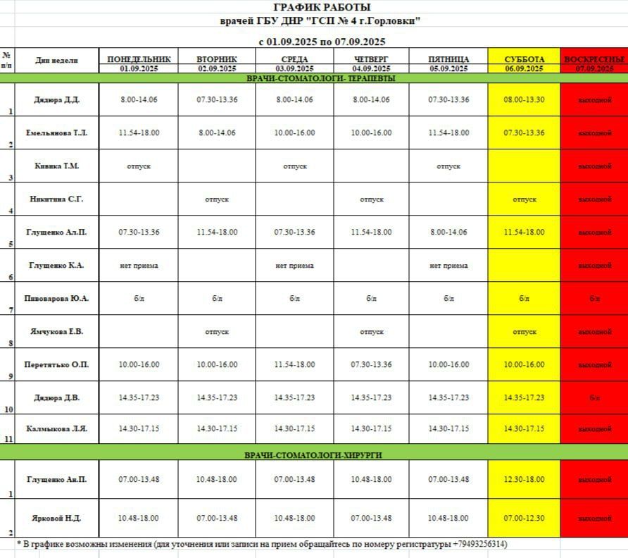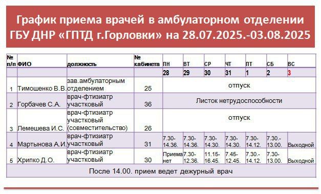 Иван Приходько: График работы специалистов ГБУ ДНР «ГДВД г.Горловки», ГБУ ДНР «ГСП № 4 г.Горловки», ГБУ ДНР «ГДСП г.Горловки», ГБУ ДНР «Городской наркологический диспансер г. Горловки», ГБУ ДНР «ГСП г.Горловка», ГБУ ДНР «ГПБ...