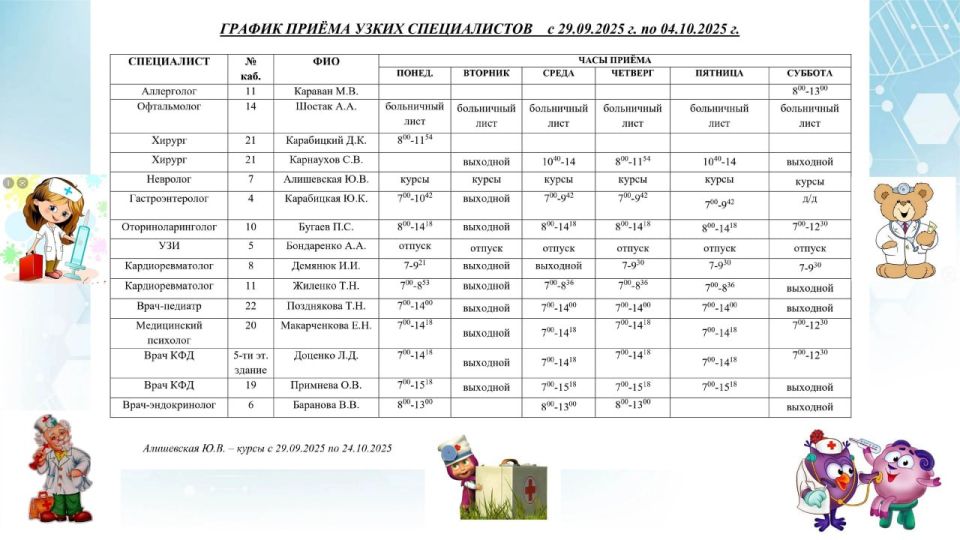 График работы специалистов ГБУ ДНР «ГДСП г.Горловки», ГБУ ДНР «Городской наркологический диспансер г. Горловки», ГБУ ДНР «ГПБ г. Горловки», ГБУ ДНР «ГПТД г.Горловки», ГБУ ДНР «ЦОМД г. Горловки», ГБУ ДНР «ГСП г.Горловки», ГБУ ДНР «ГОД г. Горловки»