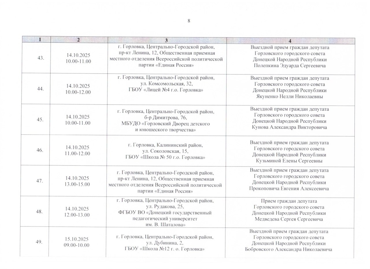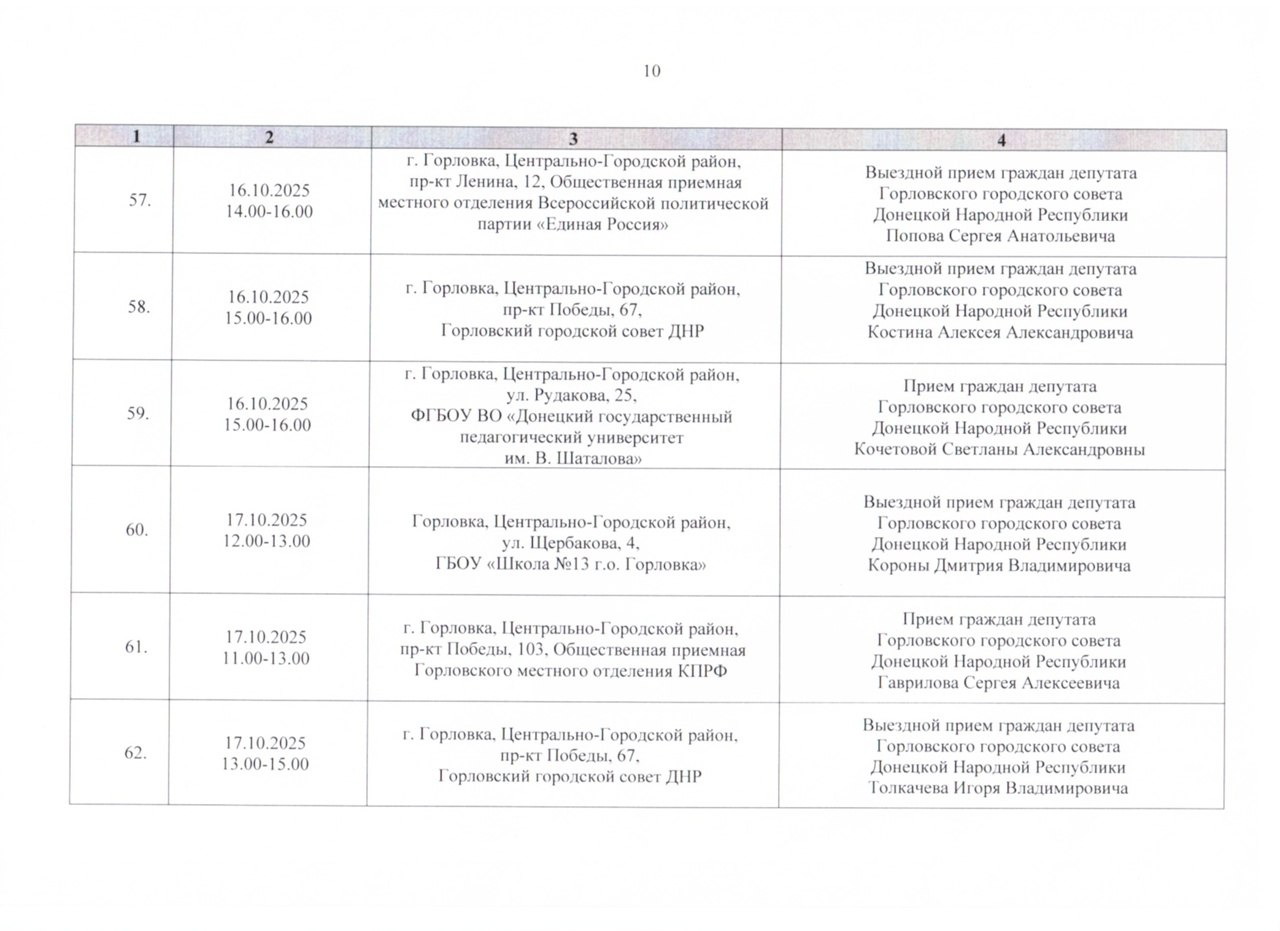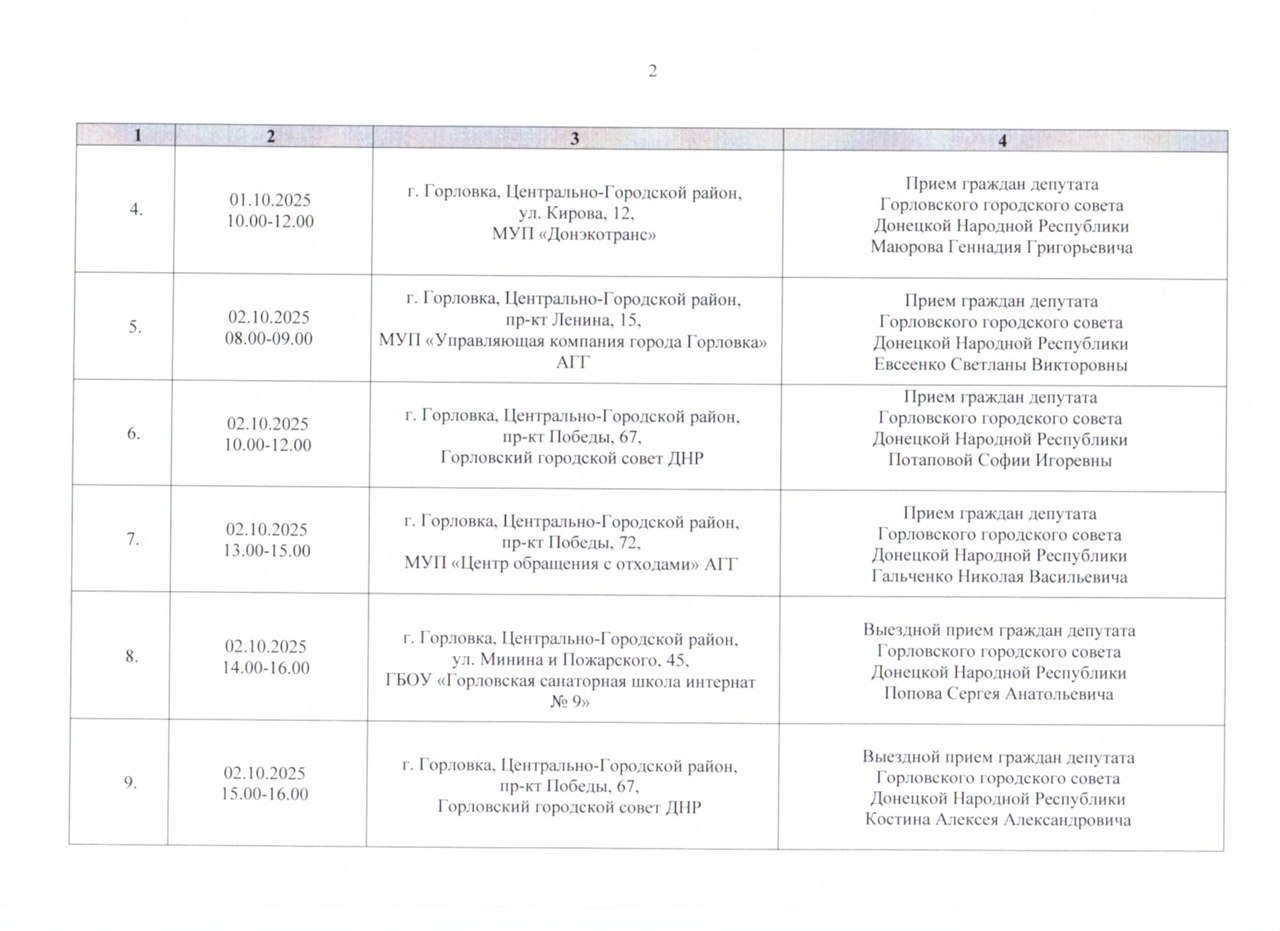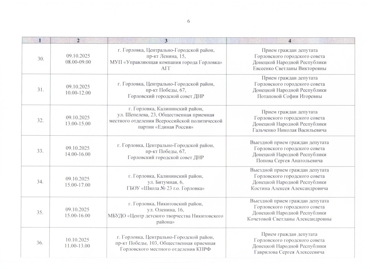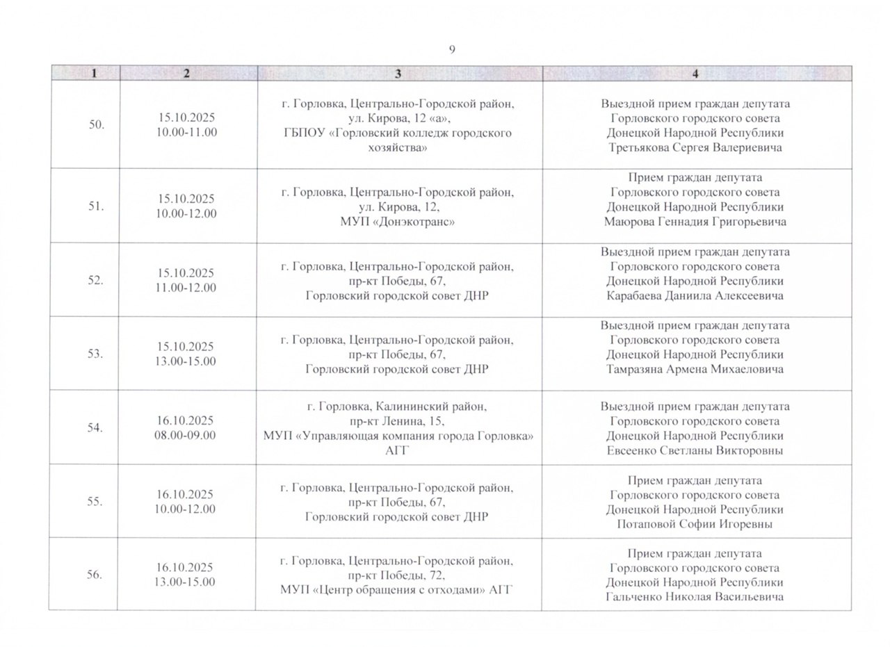 График проведения приёмов депутатами Горловского городского совета Донецкой Народной Республики первого созыва на период с 01.10.2025 г. по 31.10.2025 г. (часть 1)