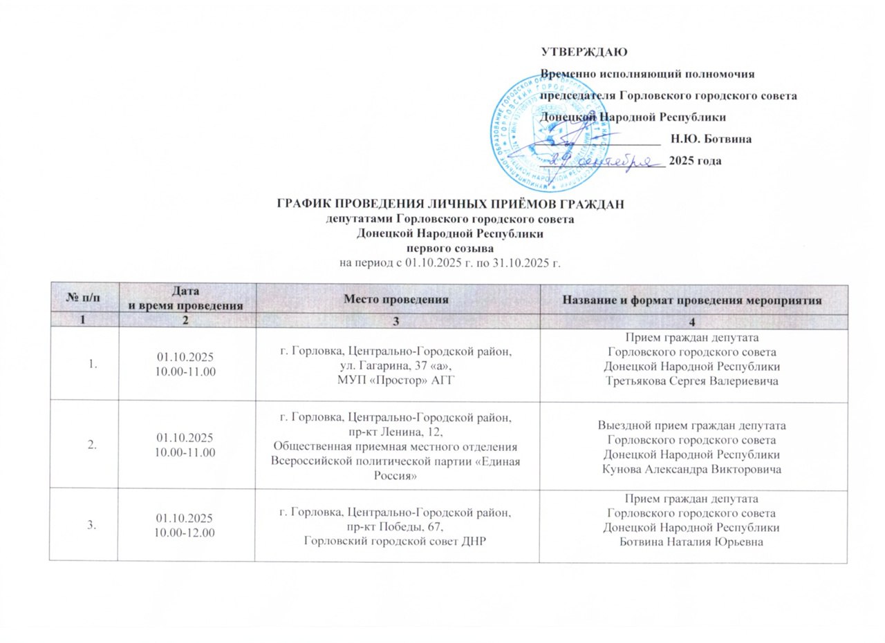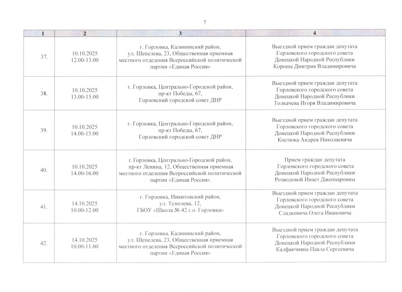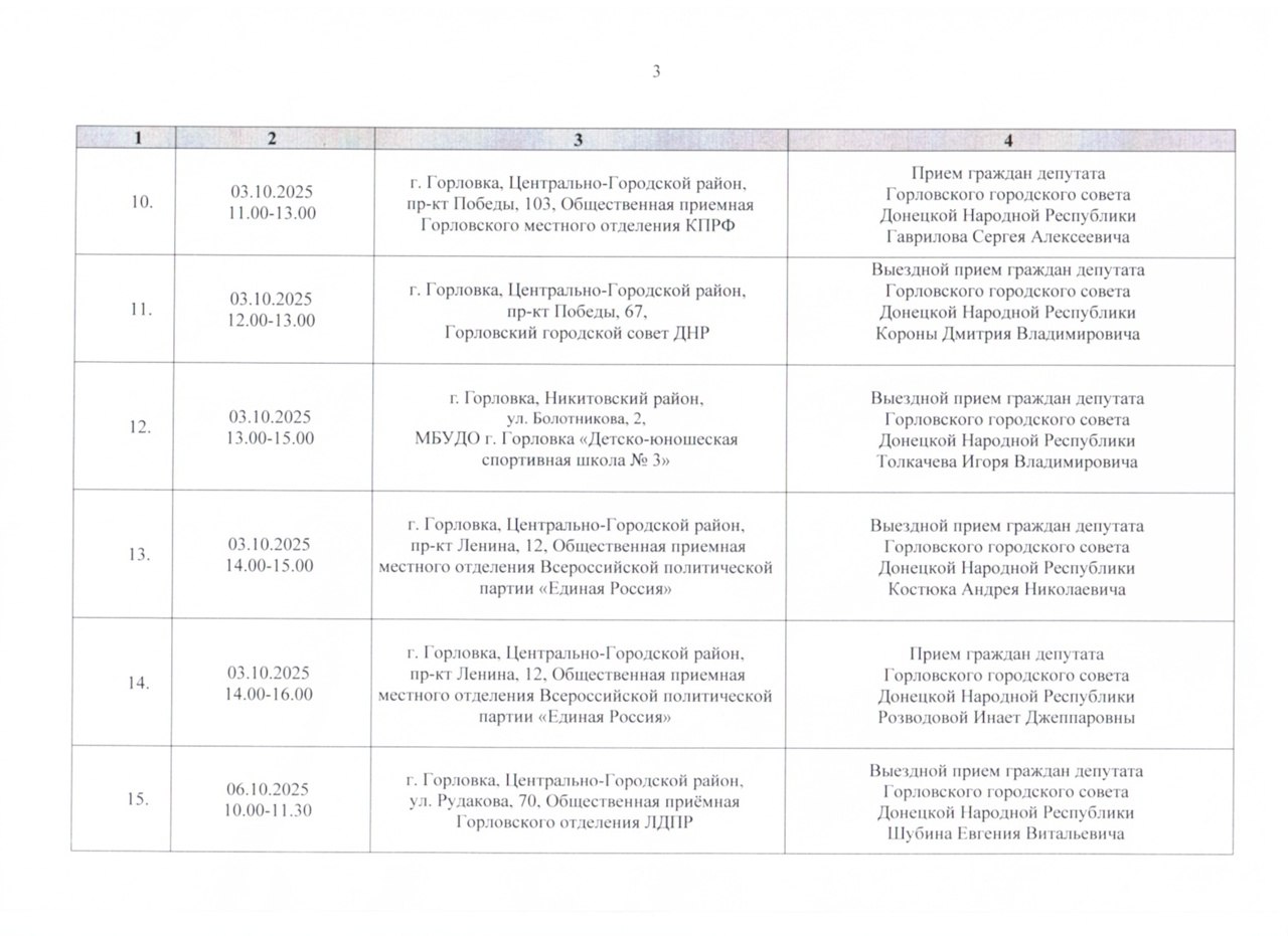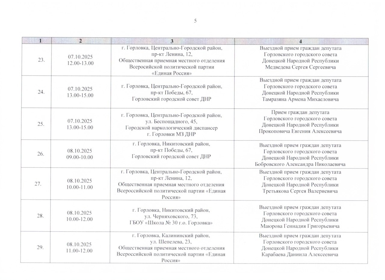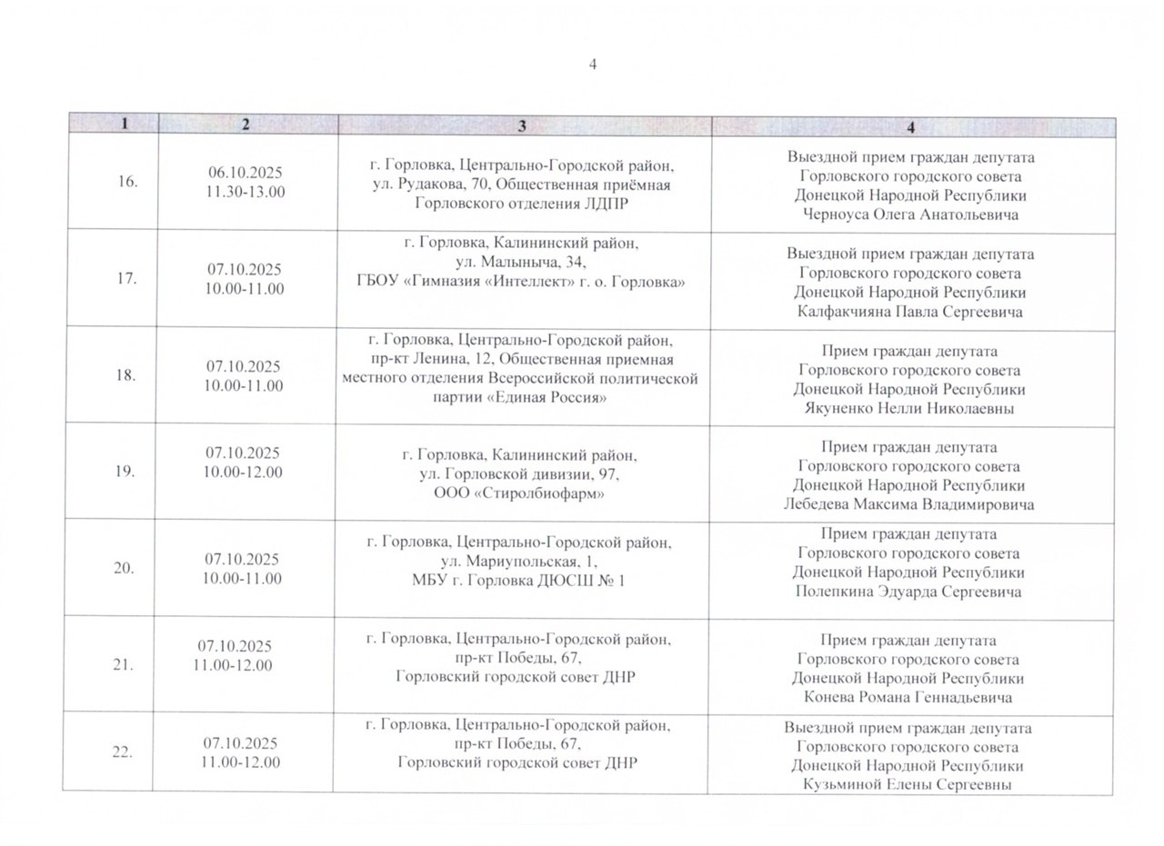 График проведения приёмов депутатами Горловского городского совета Донецкой Народной Республики первого созыва на период с 01.10.2025 г. по 31.10.2025 г. (часть 1)