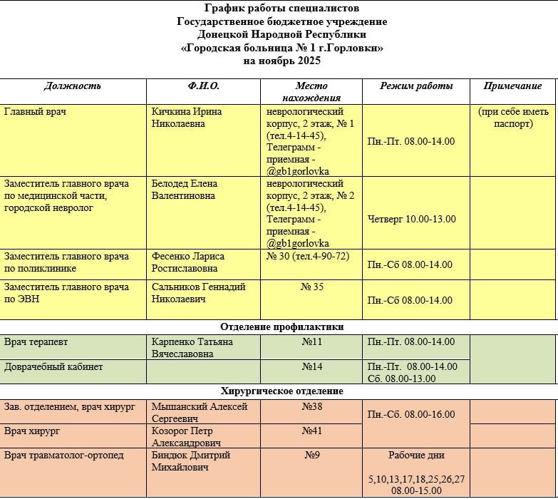 График работы специалистов ГБУ ДНР «Городская больница № 1 г. Горловки» и ГБУ ДНР «Городская больница № 3 г. Горловки»