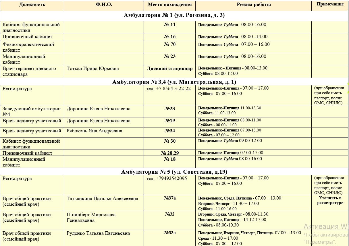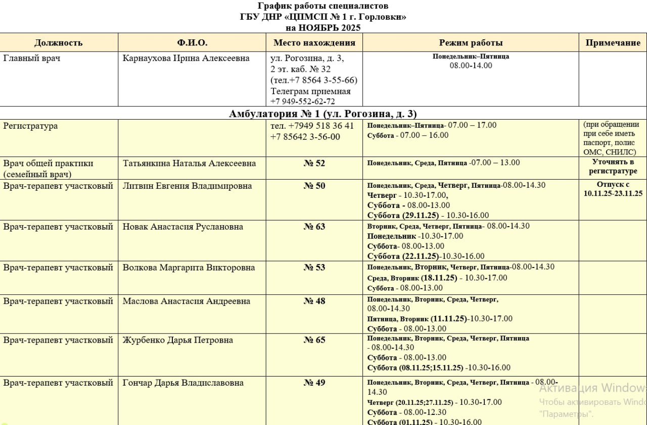 График работы специалистов ГБУ ДНР «Городская больница № 1 г. Горловки» и ГБУ ДНР «Городская больница № 3 г. Горловки»