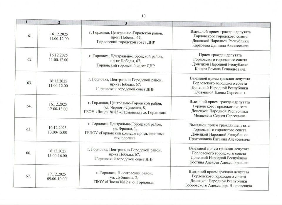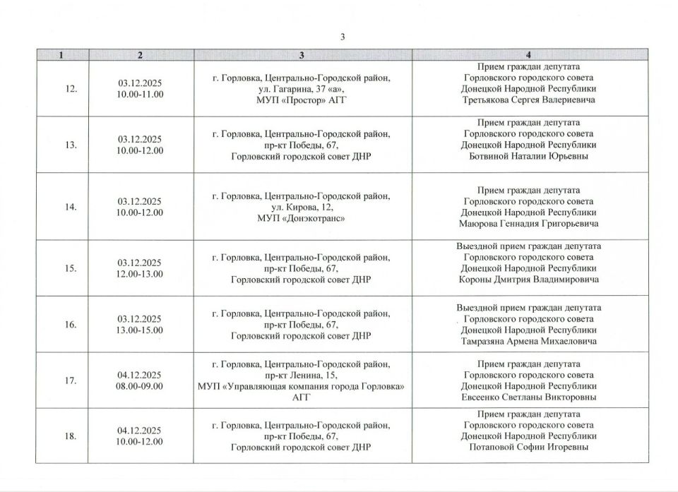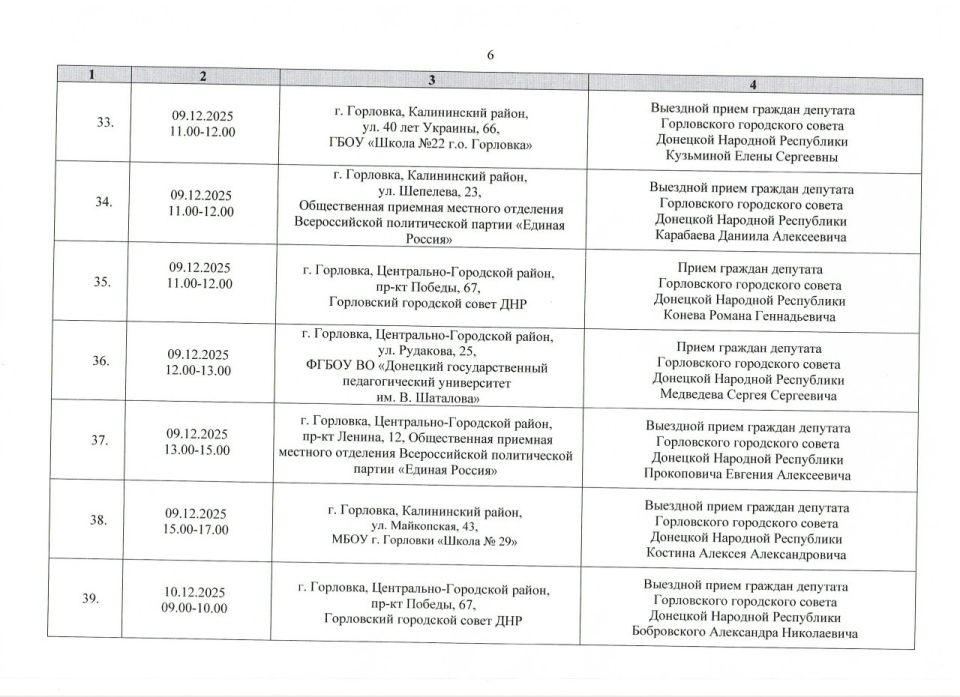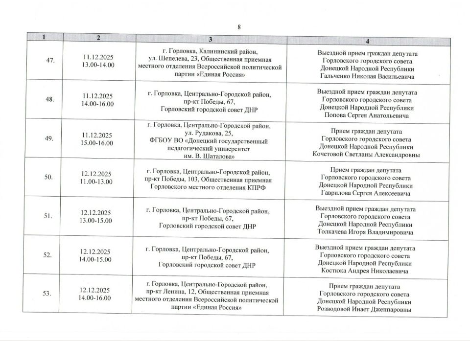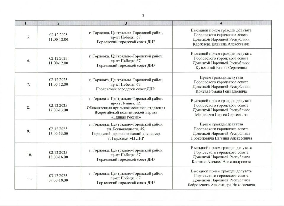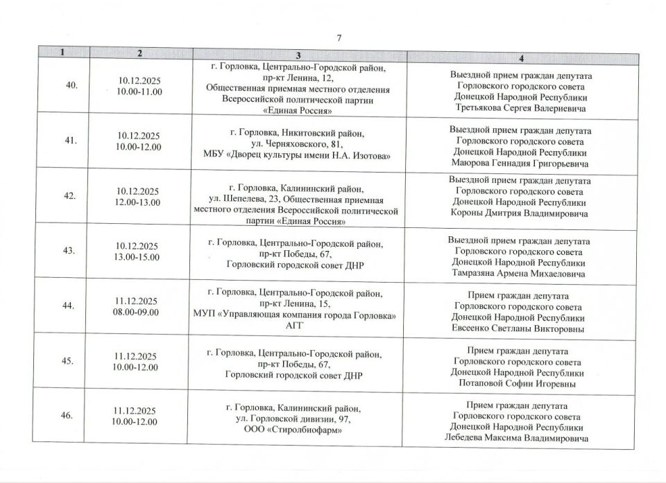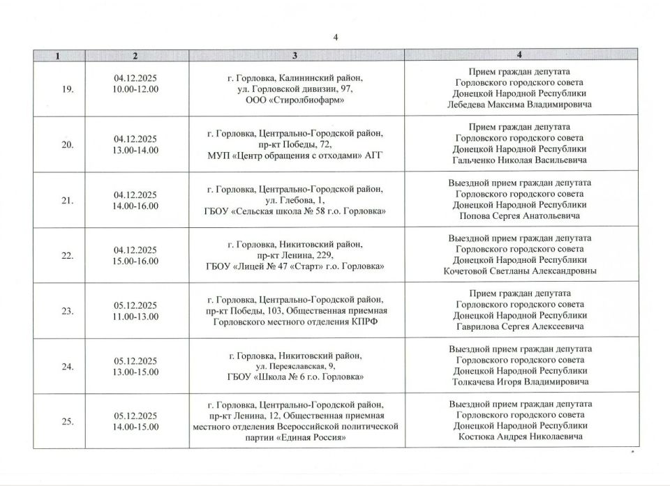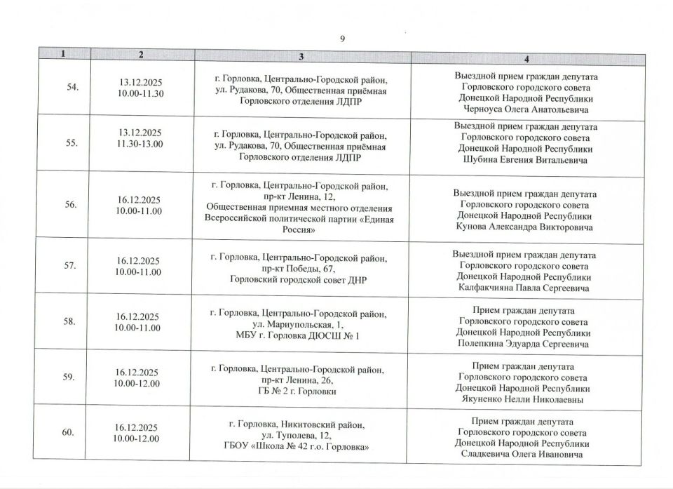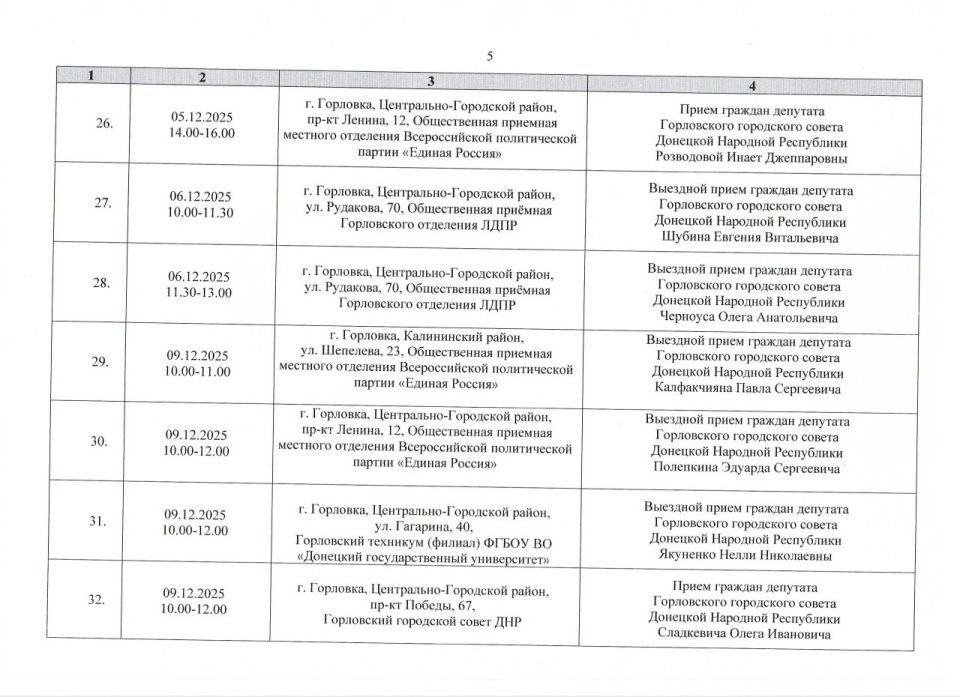 График проведения приёмов депутатами Горловского городского совета Донецкой Народной Республики первого созыва на период с 01.12.2025 г. по 31.12.2025 г. (часть 1)