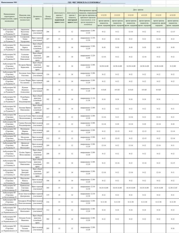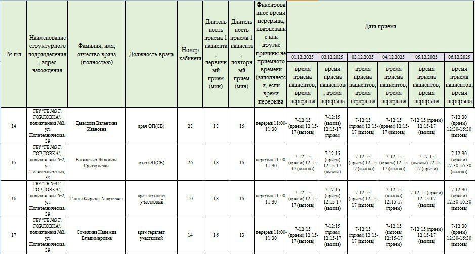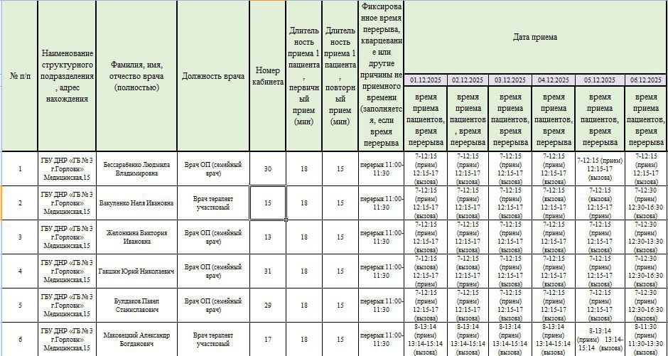 Иван Приходько: График работы специалистов ГБУ ДНР «Городская больница № 1 г. Горловки» и ГБУ ДНР «Городская больница № 3 г. Горловки», ГБУ ДНР «ЦПМСП № 2 г. Горловки»
