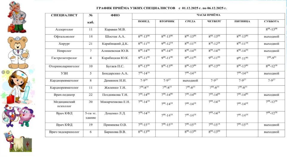 График работы специалистов ГБУ ДНР «ГДСП г.Горловки», ГБУ ДНР «Городской наркологический диспансер г. Горловки», ГБУ ДНР «ГПБ г. Горловки», ГБУ ДНР «ГПТД г.Горловки», ГБУ ДНР «ГДВД г.Горловки», ГБУ ДНР «ГСП г.Горловки», ГБУ ДНР «ГОД г. Горловки», ГБУ ДНР «ГСП № 4 г.Горловки», ГБУ ДНР «ЦОМД г. Горловки»