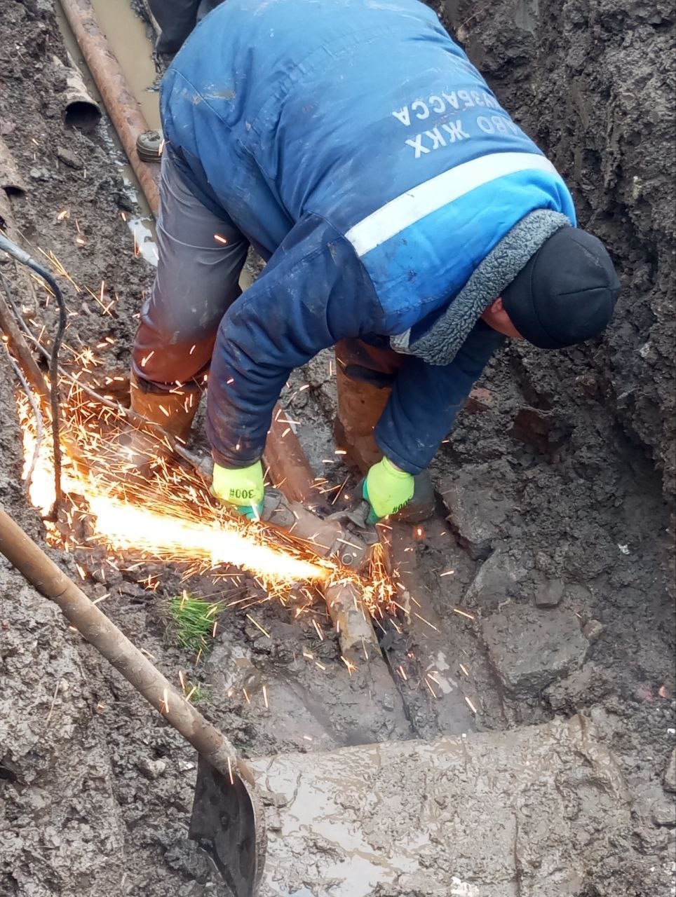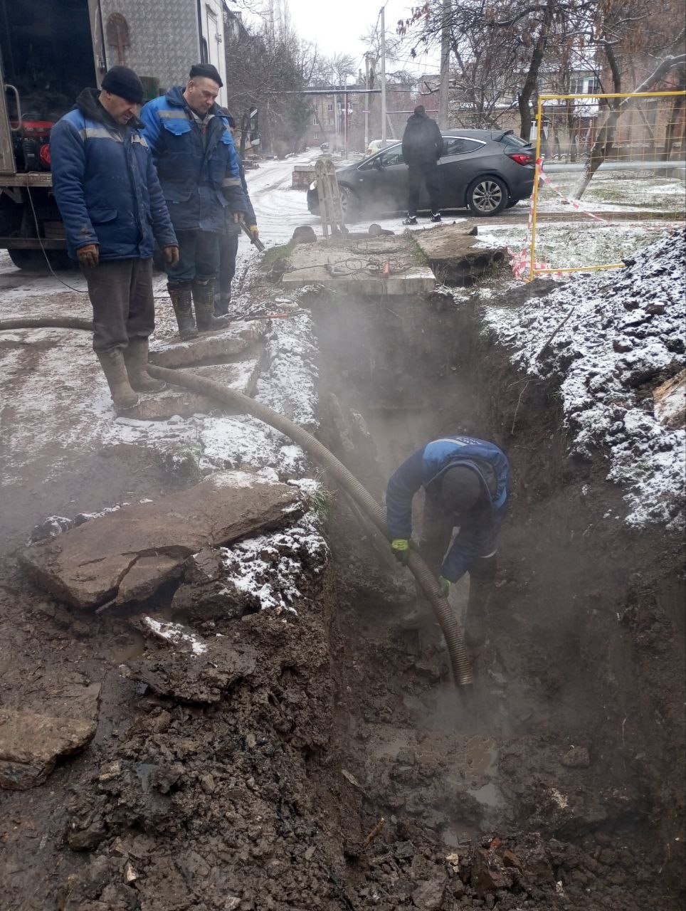 В Калининском районе города аварийная бригада в составе слесарей Александра Зозули, Андрея Черненко и Романа Руссу, а также машиниста экскаватора Михаила Ковалёва под руководством мастера Николая Чепы выполняет вскрытие теплового канала для дальнейшего выполнения ремонтных работ по замене аварийного участка теплотрассы.