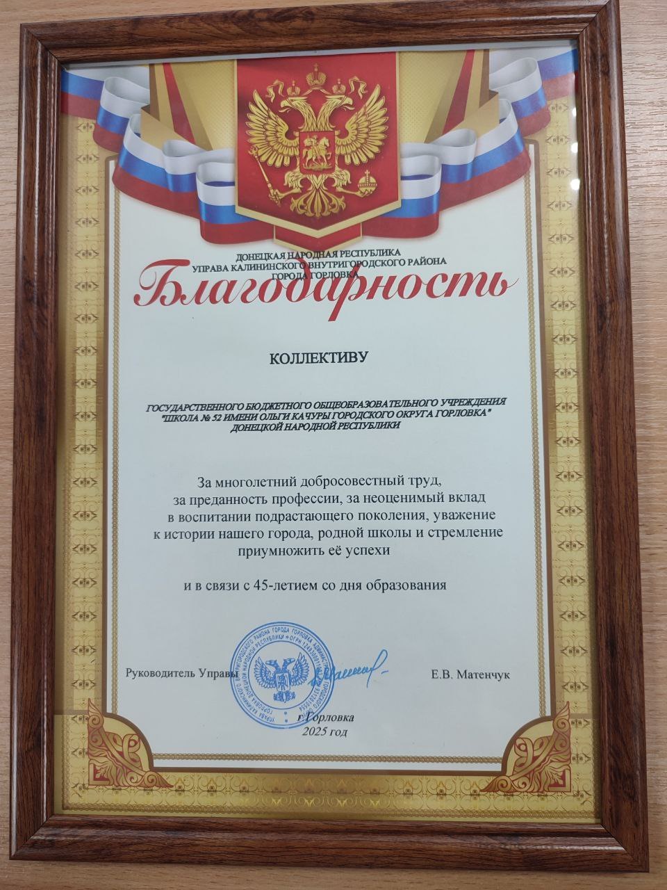 Заместитель руководителя Управы Калининского внутригородского района, член партии «Единая Россия» Валентина Лукьянчук в рамках реализации нового регионального партийного проекта «Дети Донбасса» поздравила педагогический коллектив и директора ГБОУ «Школа №52 имени Ольги Качуры» Марину Анатольевну Полякову с 45-летием со дня основания учебного заведения.