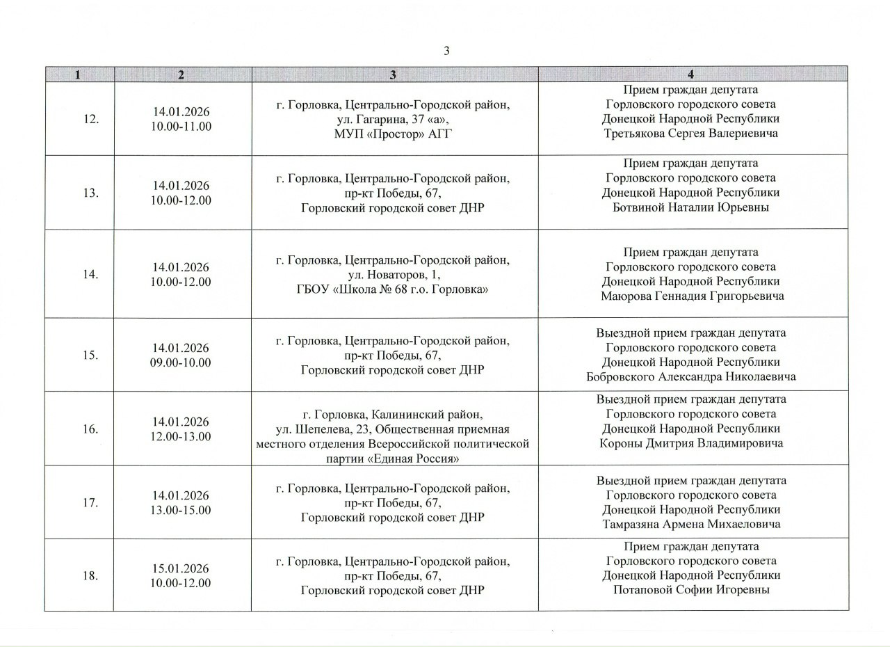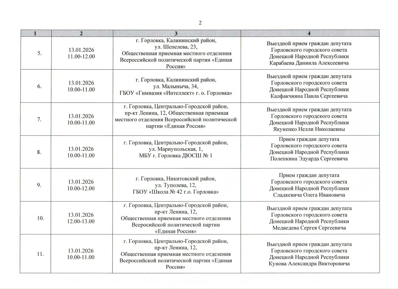 График проведения приёмов депутатами Горловского городского совета Донецкой Народной Республики первого созыва на период с 01.01.2026 г. по 31.01.2026 г. (часть 1)