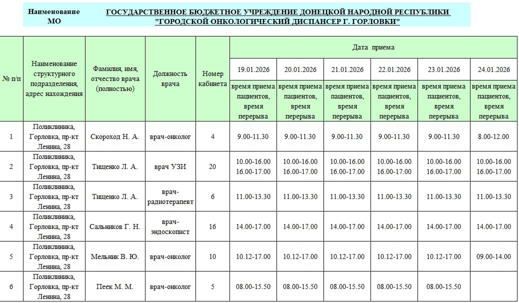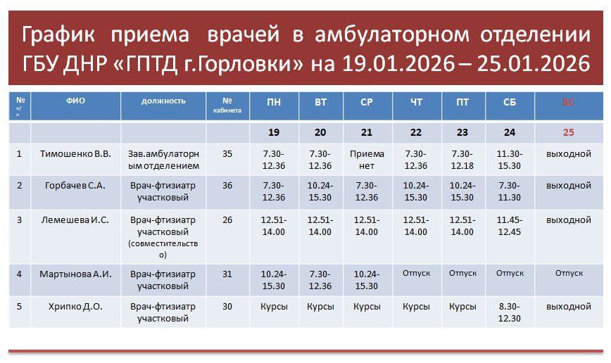 Иван Приходько: График работы специалистов ГБУ ДНР «ГДСП г.Горловки», ГБУ ДНР «Городской наркологический диспансер г. Горловки», ГБУ ДНР «ГПБ г. Горловки», ГБУ ДНР «ГПТД г.Горловки», ГБУ ДНР «ГДВД г.Горловки», ГБУ ДНР «ГСП...