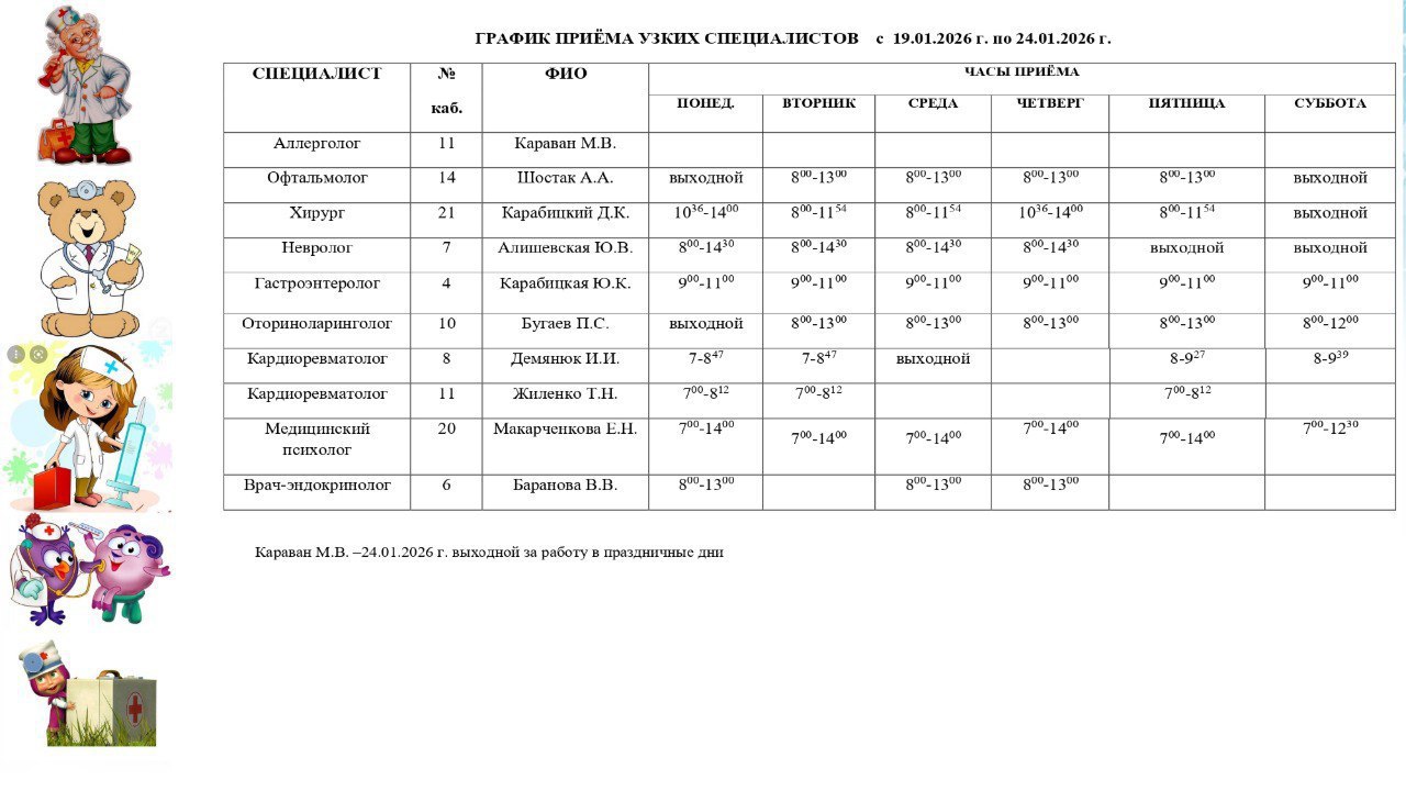 График работы специалистов ГБУ ДНР «ГДСП г.Горловки», ГБУ ДНР «Городской наркологический диспансер г. Горловки», ГБУ ДНР «ГПБ г. Горловки», ГБУ ДНР «ГПТД г.Горловки», ГБУ ДНР «ГДВД г.Горловки», ГБУ ДНР «ГСП г.Горловки», ГБУ ДНР «ГОД г....