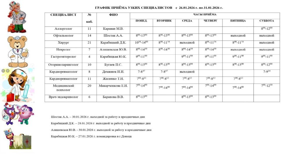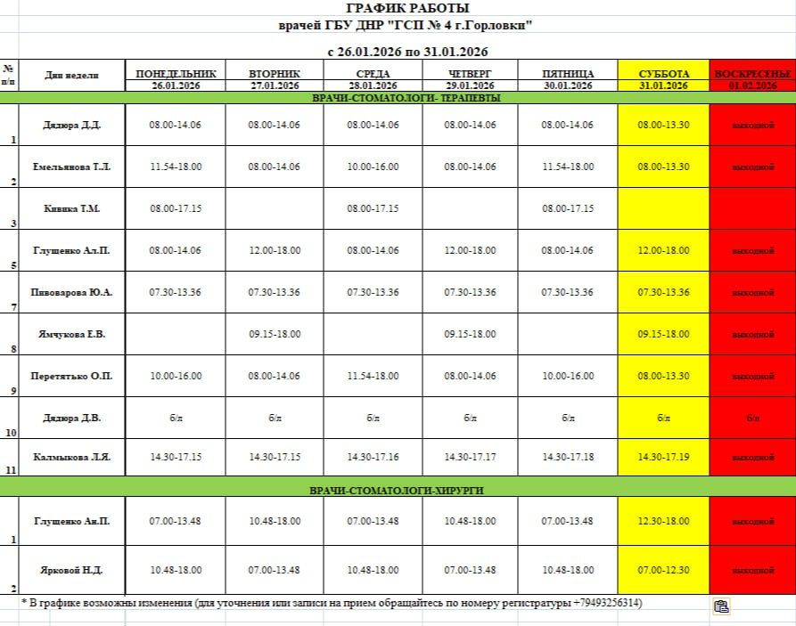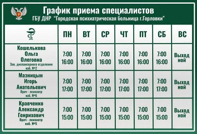 Иван Приходько: График работы специалистов ГБУ ДНР «ГДСП г.Горловки», ГБУ ДНР «Городской наркологический диспансер г. Горловки», ГБУ ДНР «ГПБ г. Горловки», ГБУ ДНР «ГПТД г.Горловки», ГБУ ДНР «ГДВД г.Горловки», ГБУ ДНР «ГСП...