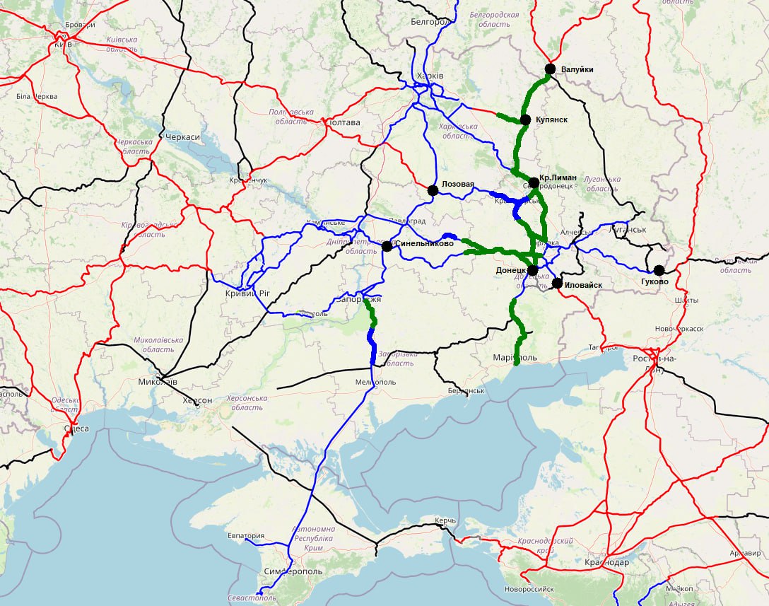 На этой схеме очень хорошо просматривается потенциальный магистральный и короткий ход на Донбасс и Крым, который гипотетически может быть введен в строй в случае окончания войны по нынешней ЛБС, но частично скорректированной на запад. Это бывшая "московская угольная" линия, вливающаяся в восточный рукав Главного Южного хода СССР. Сам он в его классическом советским виде, к сожалению, вряд ли перейдёт целиком под контроль РФ в нынешних военно-стратегических реалиях - для этого нужно взять Харьков с Запорожьем и выйти на линию западнее Синельниково и Лозовой.