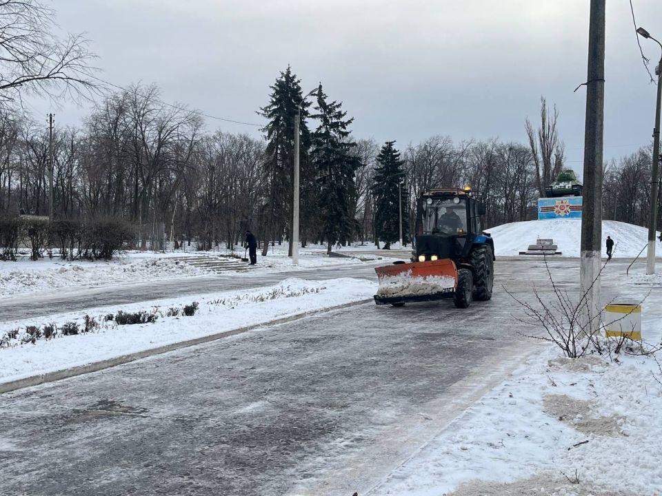 Коммунальными службами выполняются механизированная очистка и посыпка дорог противогололёдными смесями, кронирование деревьев с вывозом веток, а также очистка ливневой канализации от снега.