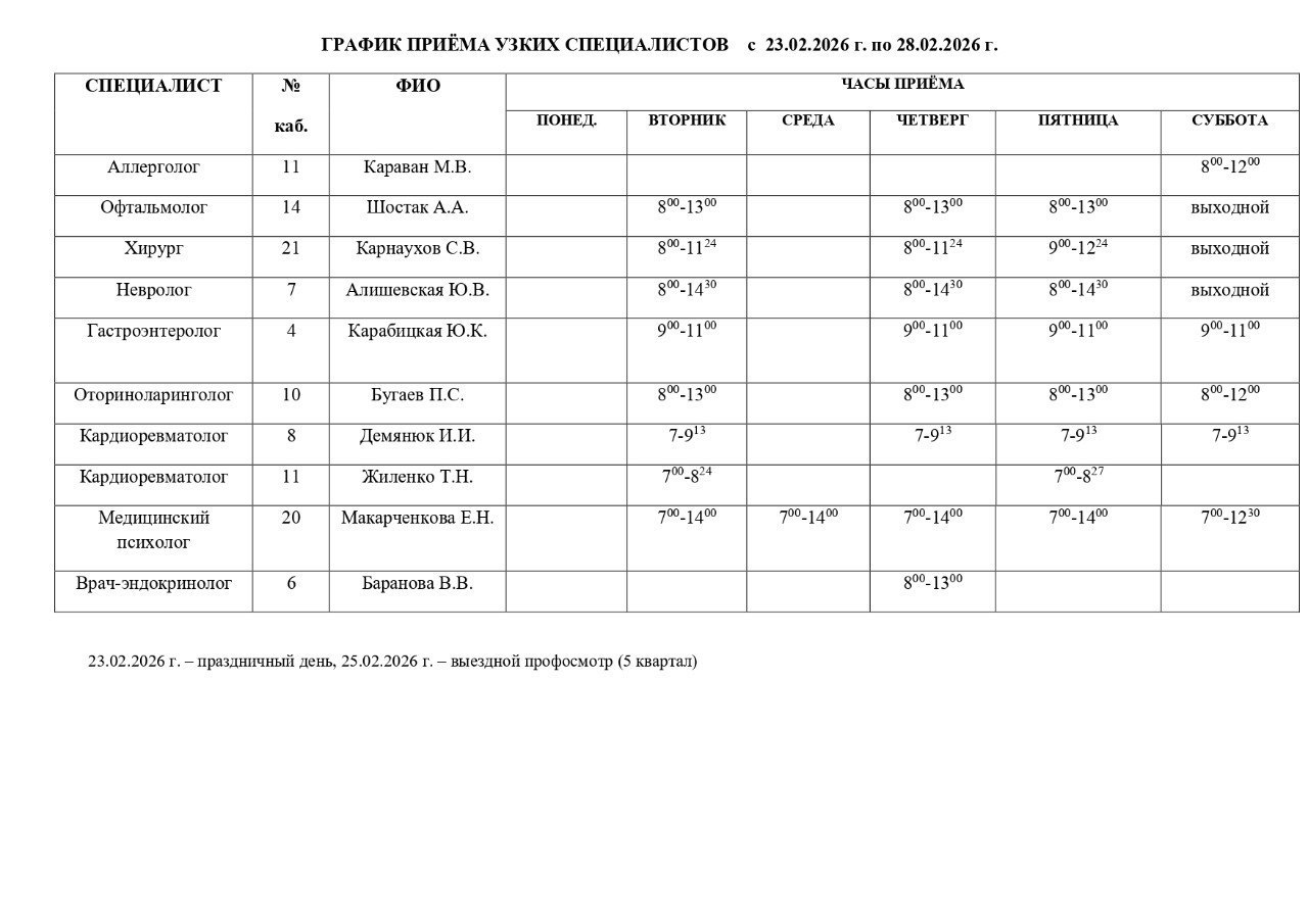 График работы специалистов ГБУ ДНР «ГДСП г.Горловки», ГБУ ДНР «Городской наркологический диспансер г. Горловки», ГБУ ДНР «ГПБ г. Горловки», ГБУ ДНР «ГПТД г.Горловки», ГБУ ДНР «ГДВД г.Горловки», ГБУ ДНР «ГСП г.Горловки», ГБУ ДНР «ГОД г. Горловки», ГБУ ДНР «ГСП № 4 г.Горловки», ГБУ ДНР «ЦОМД г. Горловки»