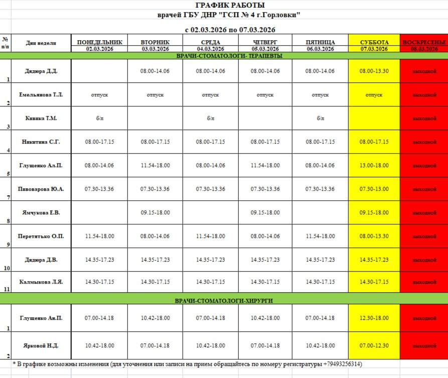 График работы специалистов ГБУ ДНР «Городская больница № 3 г. Горловки»