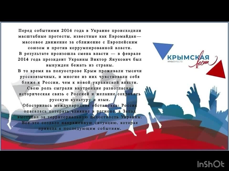 «Крымская весна: история возвращения» - в этом ролике партийцы Единой России, сотрудники Муниципального бюджетного учреждения городского округа Горловка «Городской дворец молодежи», рассказали о важнейшем событии для полуострова — Крымской весне. В марте 2014 года Крым стал свидетелем уникального исторического момента — воссоединения с Россией.