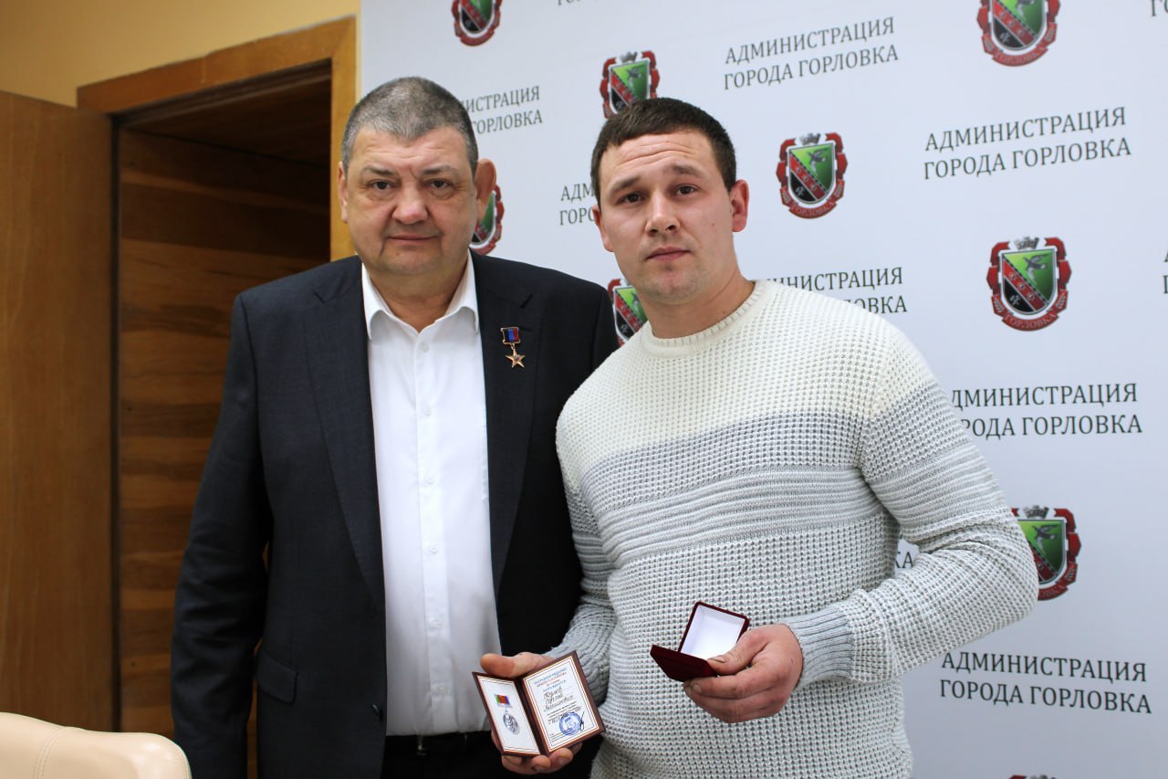Вручил награды городского округа Горловка. Герою ДНР Максиму Евгеньевичу Коршакову присвоено звание «Почетный гражданина муниципального образования городского округа Горловка Донецкой Народной Республики» за совершение героических и мужественных поступков при исполнении воинского долга по защите жизни и здоровья жителей городского округа Горловка. Также вручил горловчанину Сергею Васильевичу Козлову нагрудную медаль имени П.Н. Горлова III степени за проявленные мужество, самоотверженность и решительные действия, проявленные при спасении человека на пожаре.
