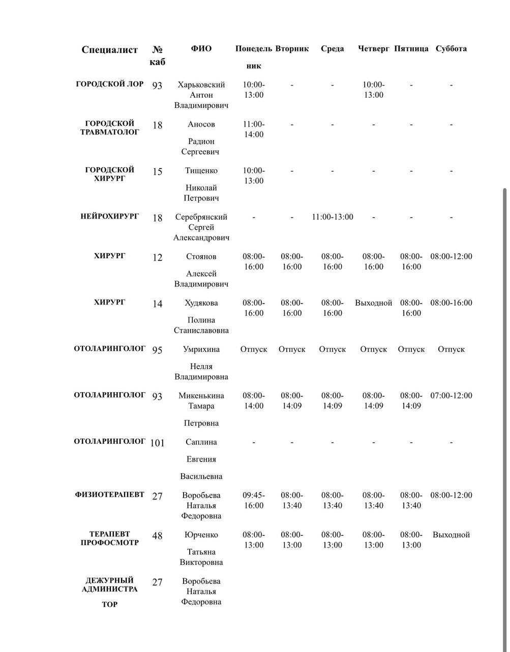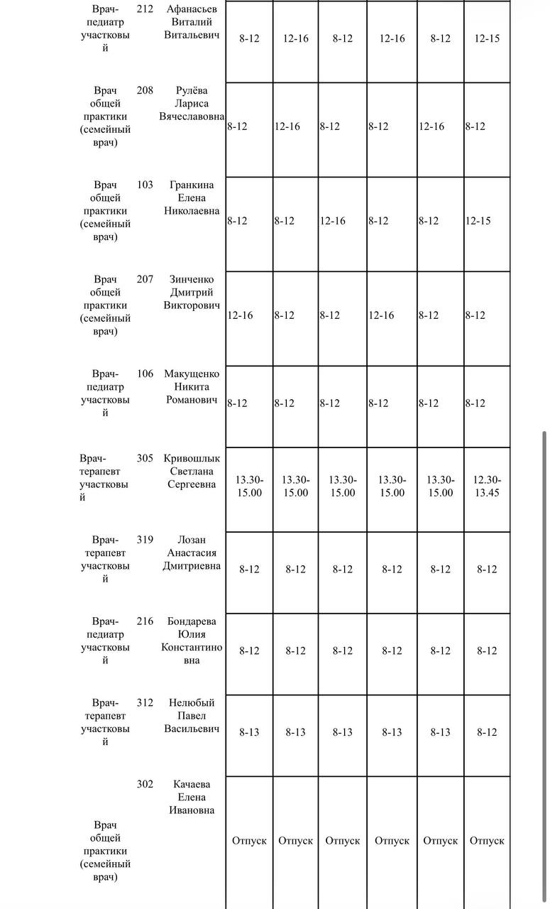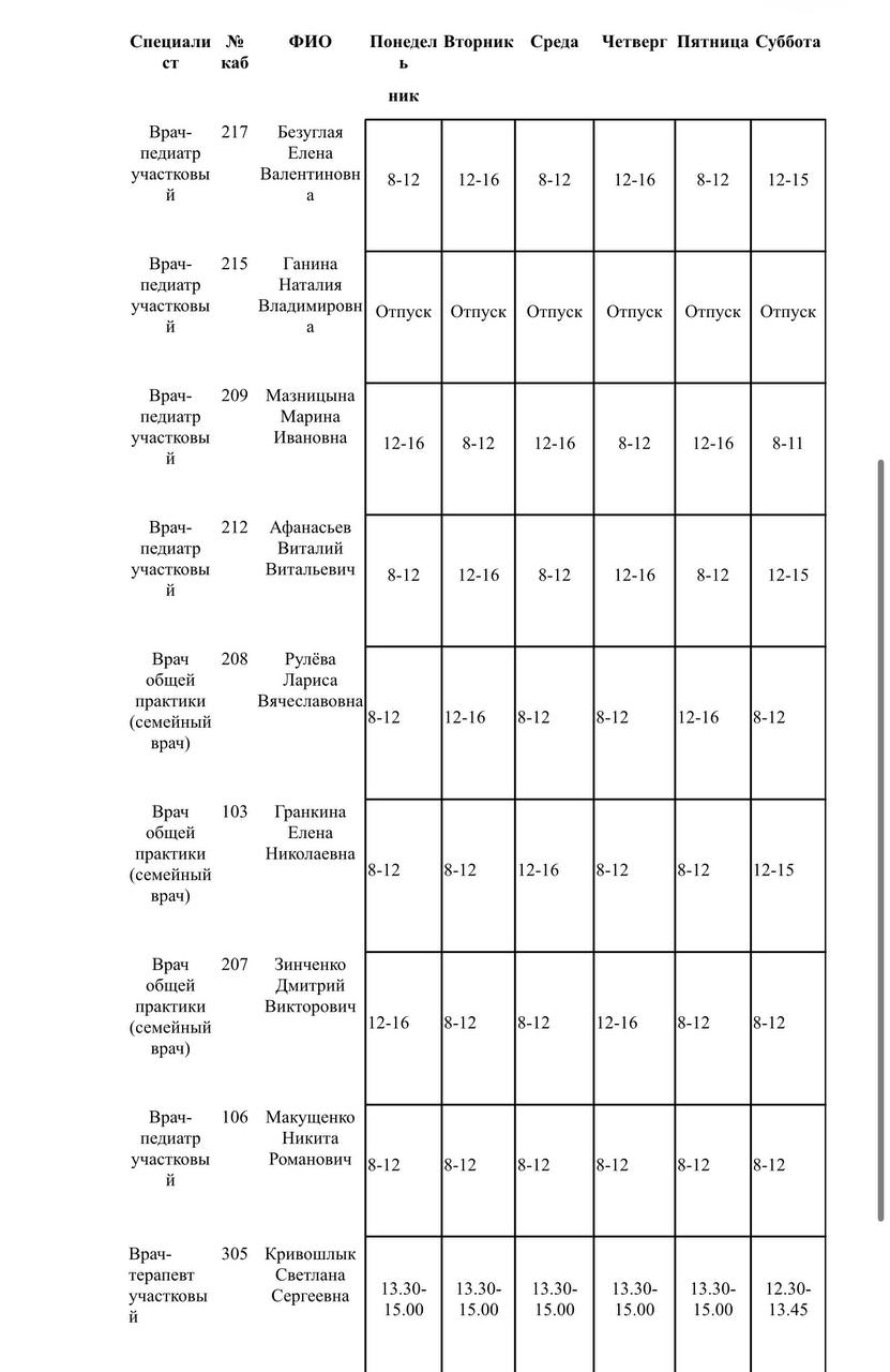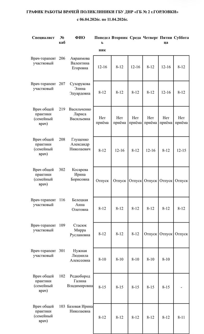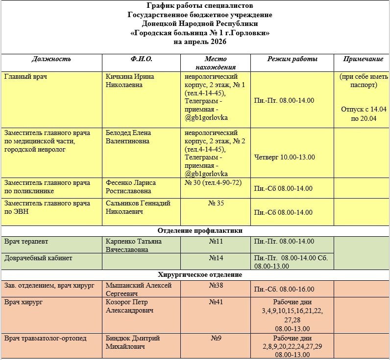 Иван Приходько: График работы специалистов ГБУ ДНР «Городская больница № 1 г. Горловки», ГБУ ДНР «Городская больница № 2 г. Горловки»