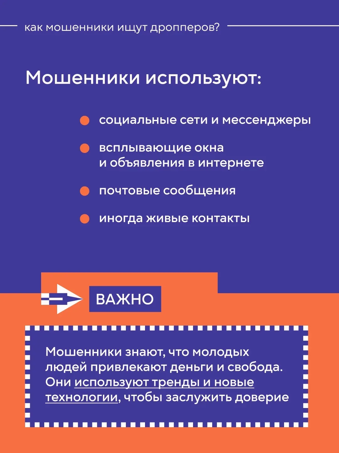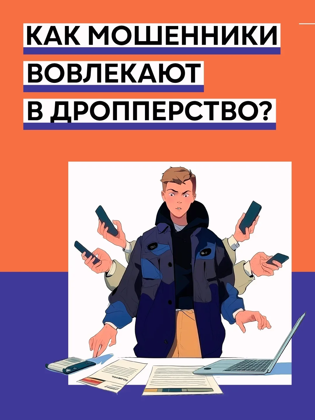 Дропперы — это те, кто выполняет роль посредников. Через них проходят украденные деньги, чтобы скрыть следы преступления. Часто обманутые граждане сами не до конца понимают, что участвуют в преступной схеме.