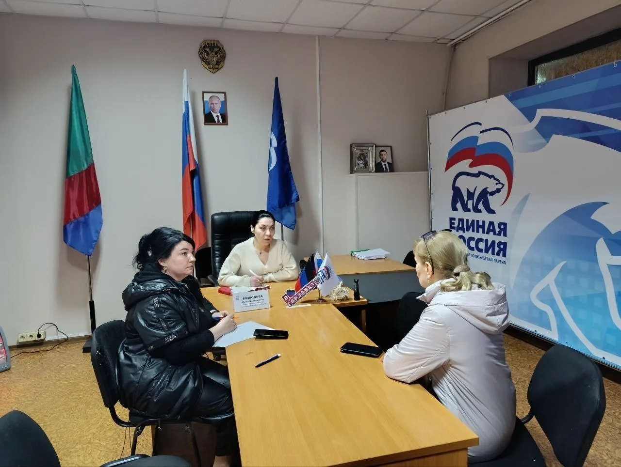 17 апреля 2026 года член Общественного совета городского округа Горловка Задарновская Анна Станиславовна посетила личный приём граждан, который провела исполнительный секретарь Горловского отделения партии «Единая Россия», депутат Горловского городского совета ДНР первого созыва Розводова Инает Джеппаровна.