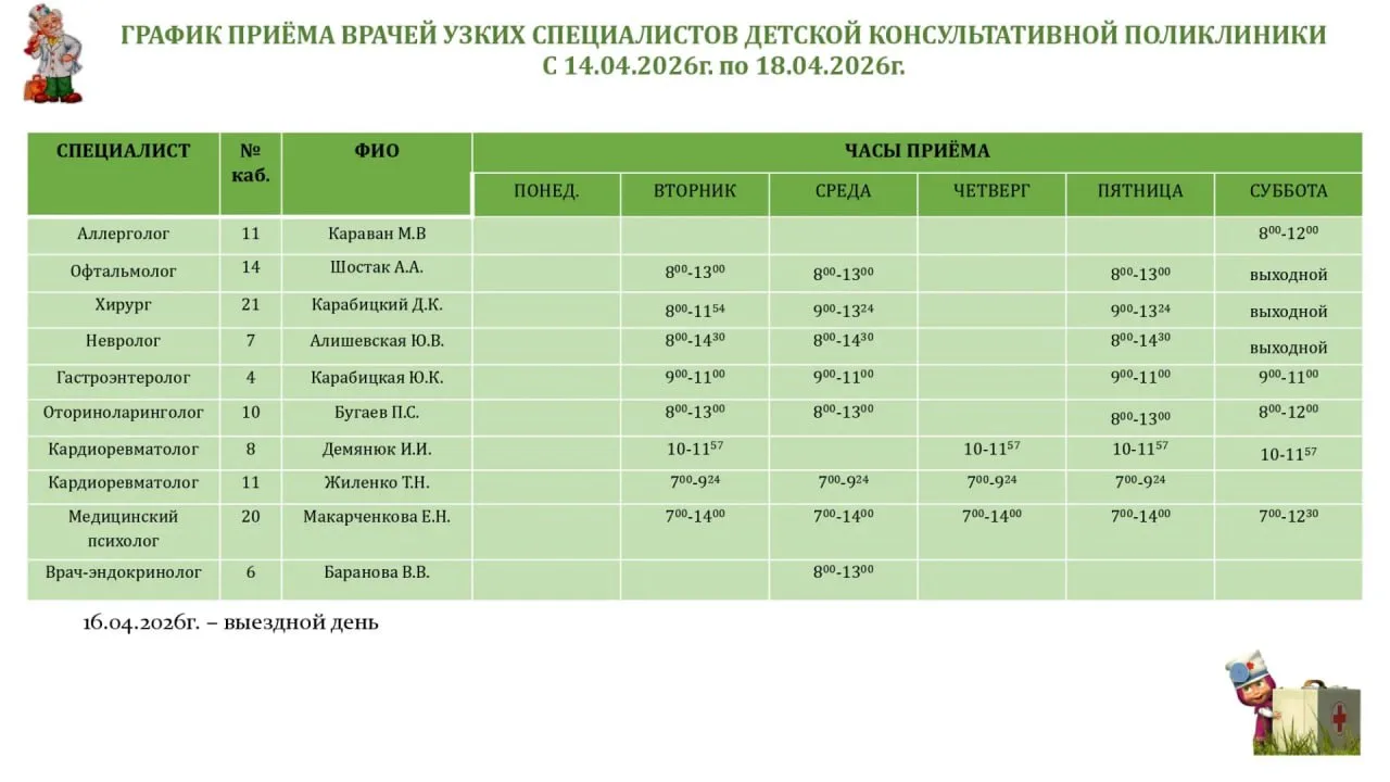 График работы специалистов ГБУ ДНР «ГДСП г.Горловки», ГБУ ДНР «Городской наркологический диспансер г. Горловки», ГБУ ДНР «ГПБ г. Горловки», ГБУ ДНР «ГПТД г.Горловки», ГБУ ДНР «ГДВД г.Горловки», ГБУ ДНР «ГСП г.Горловки», ГБУ ДНР «ГОД г. Горловки», ГБУ ДНР «ГСП № 4 г.Горловки», ГБУ ДНР «ЦОМД г. Горловки»